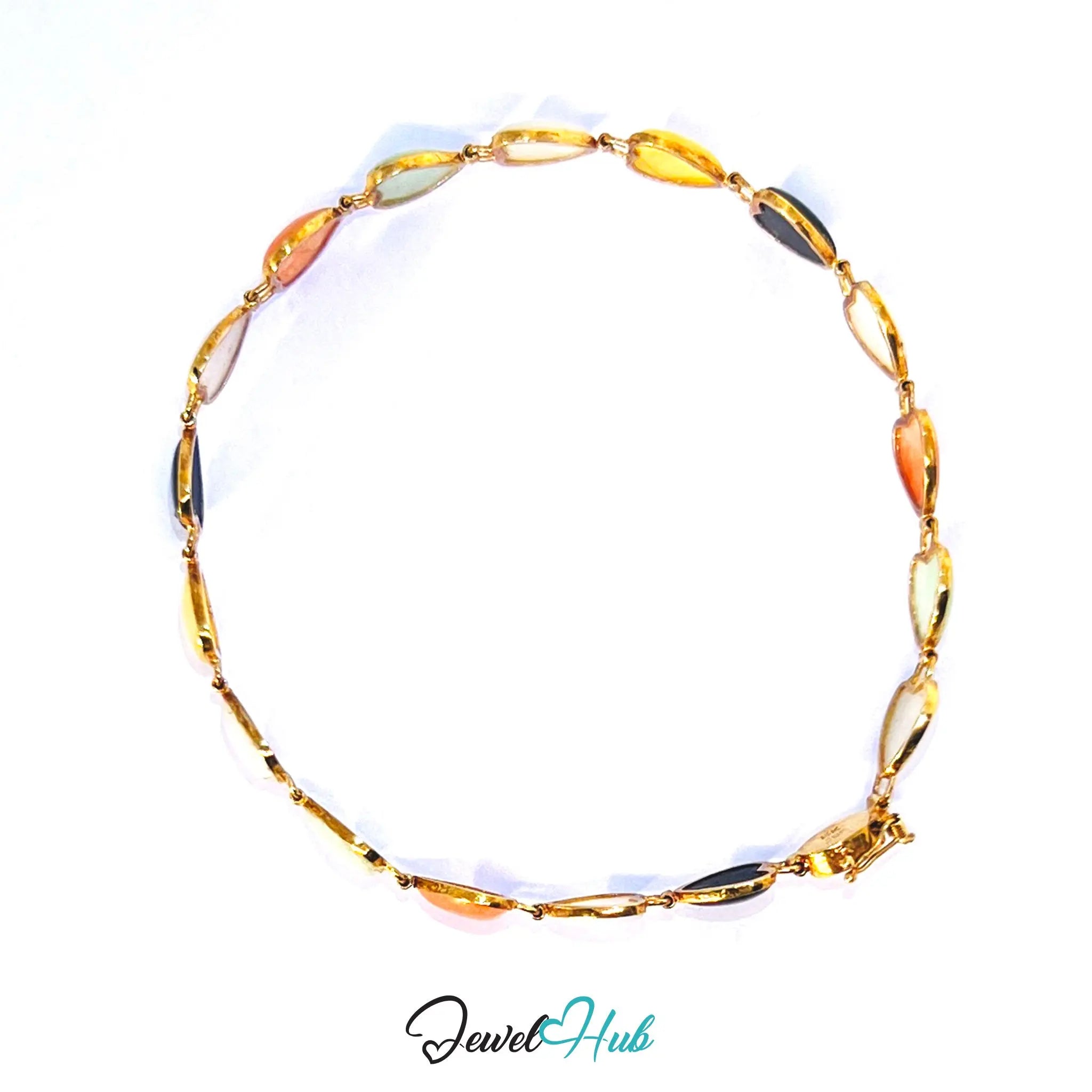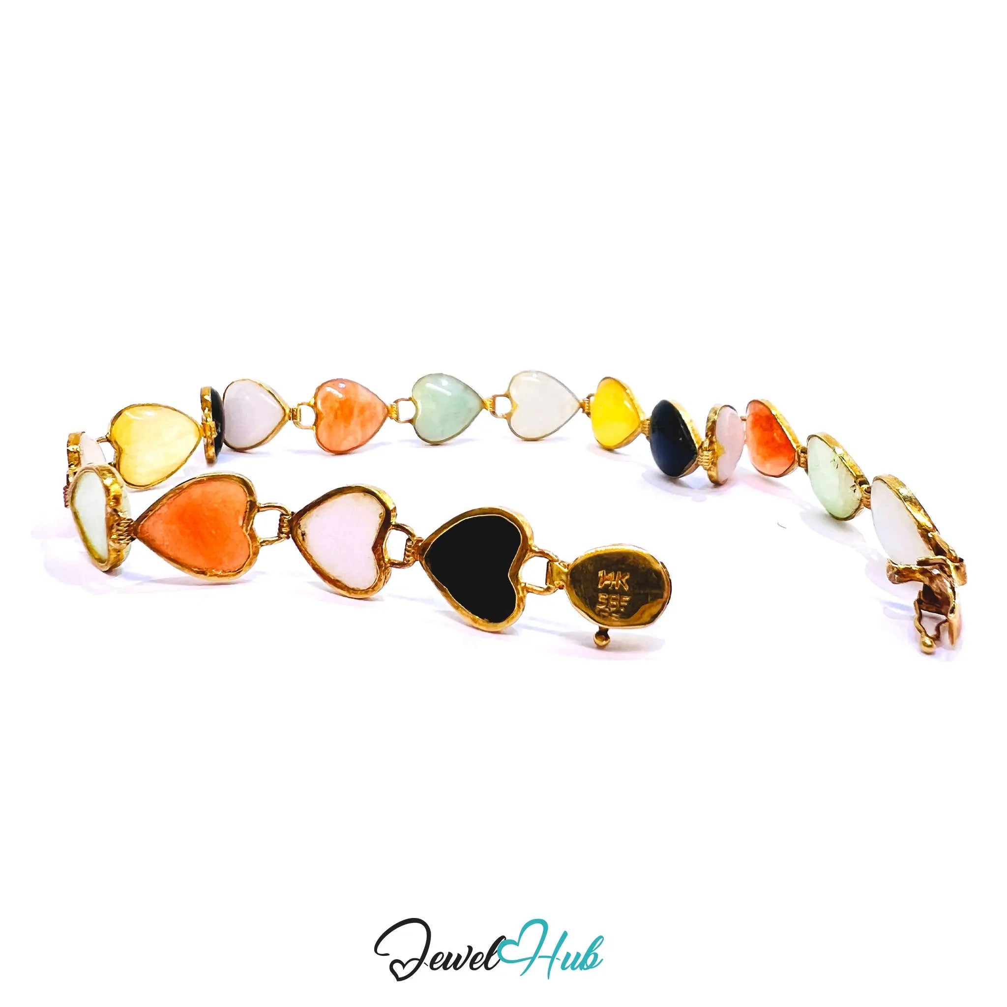 JewelHub’s 14K gold jade bracelet features 17 heart-shaped stones in a joyful mix of yellow, green, orange, white, black, and blue, each carved to 10mm × 8mm and spaced along a graceful 18cm gold chain. With a total weight of 5.86 grams, this piece blends romantic symbolism with tactile luxury.