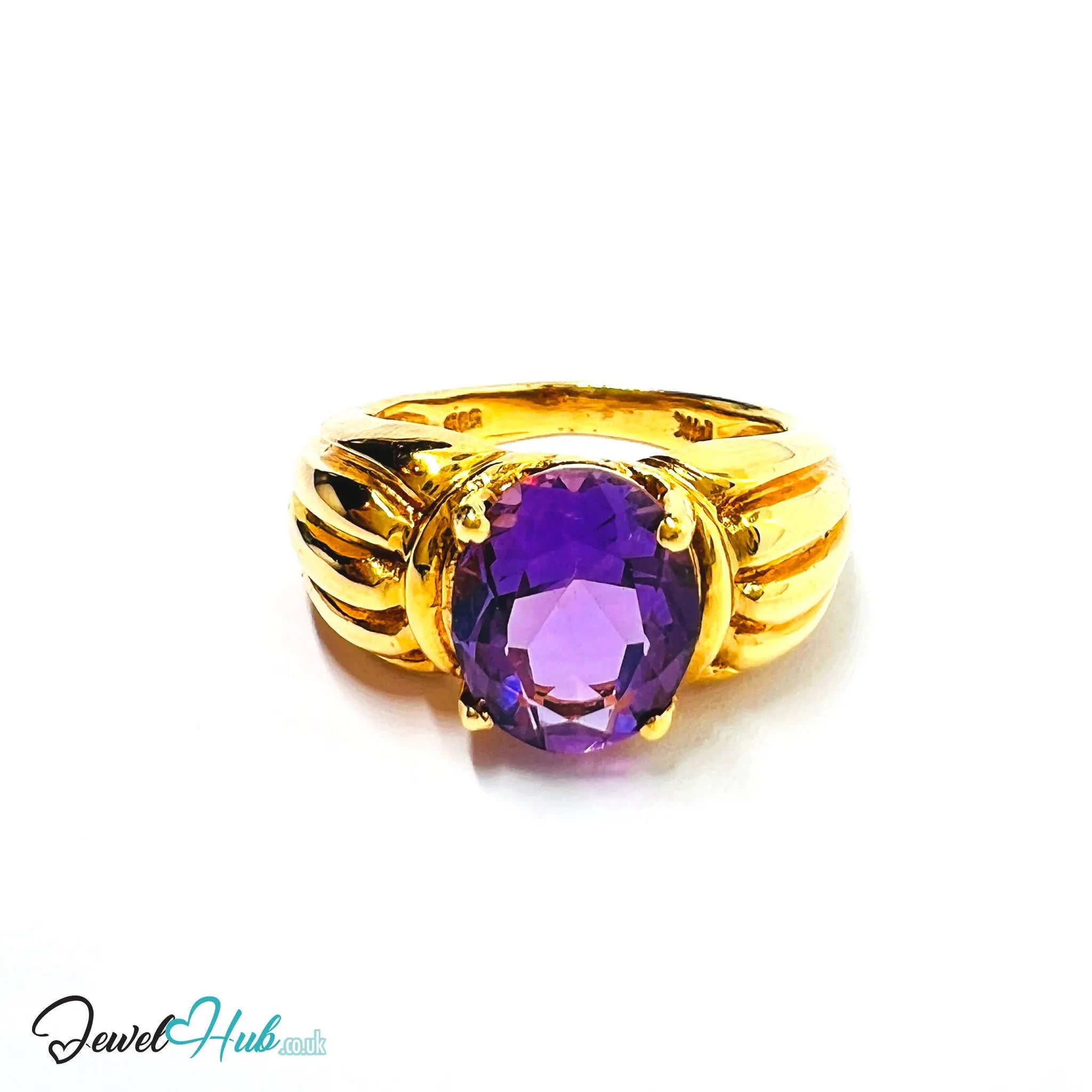 Handcrafted in 1990s Hong Kong, this solid 14k yellow gold ring showcases an oval-cut natural amethyst (approx. 2.5–3 ct), measuring 8×10 mm. With a clean bezel setting and 13 mm ring diameter, it delivers timeless elegance anchored in East Asian jewellery design traditions. Weighing a generous 7 grams, the piece reflects the quality and richness emblematic of vintage Hong Kong goldsmithing.