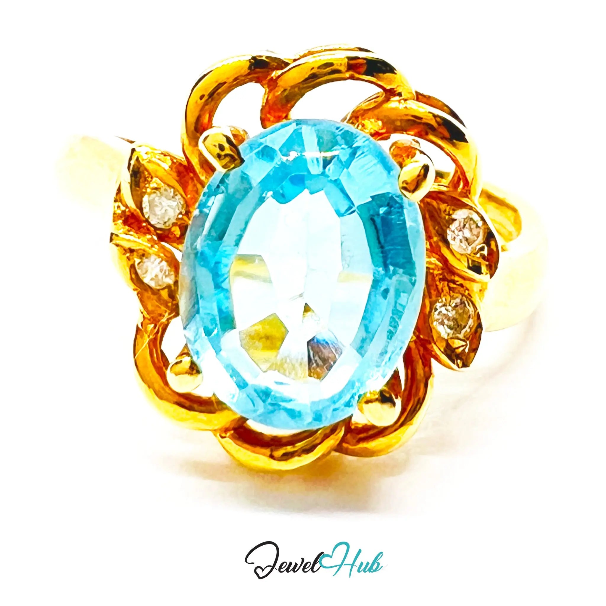 Make a bold yet graceful statement with this luminous 14K solid gold ring, featuring a 7 × 9 mm oval-cut Swiss Blue Topaz, weighing an impressive 4.19 carats. The vivid, sky-toned centre stone is flanked by four petite round-cut diamonds (1.2 mm each), adding a touch of sparkle without overpowering the main gem. The minimalist claw setting enhances light reflection and invites wearability—day or night.