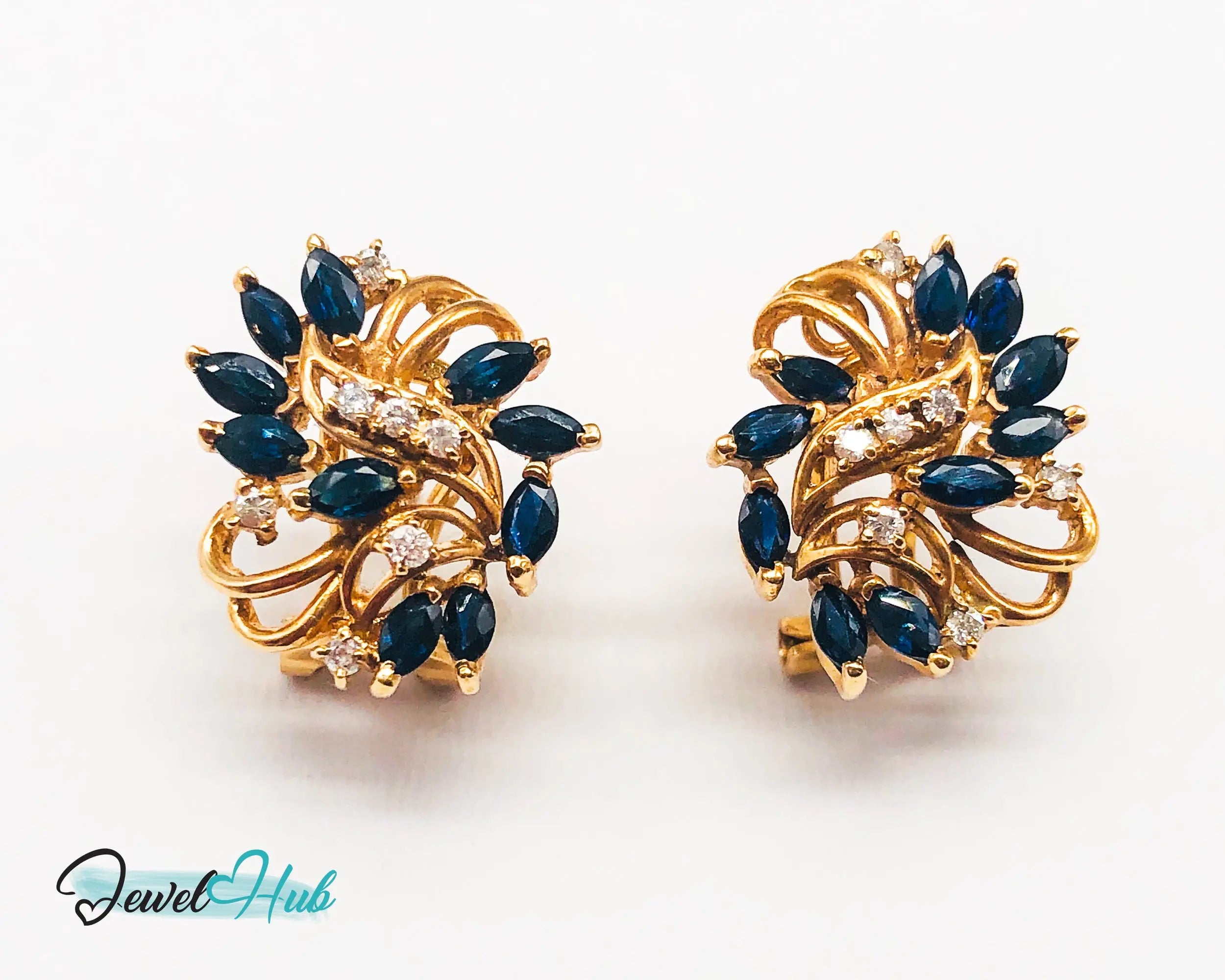 Crafted from solid 14k yellow gold, these stunning sapphire diamond earrings showcase a delicate floral design, highlighted by deep blue sapphires and brilliant diamonds.