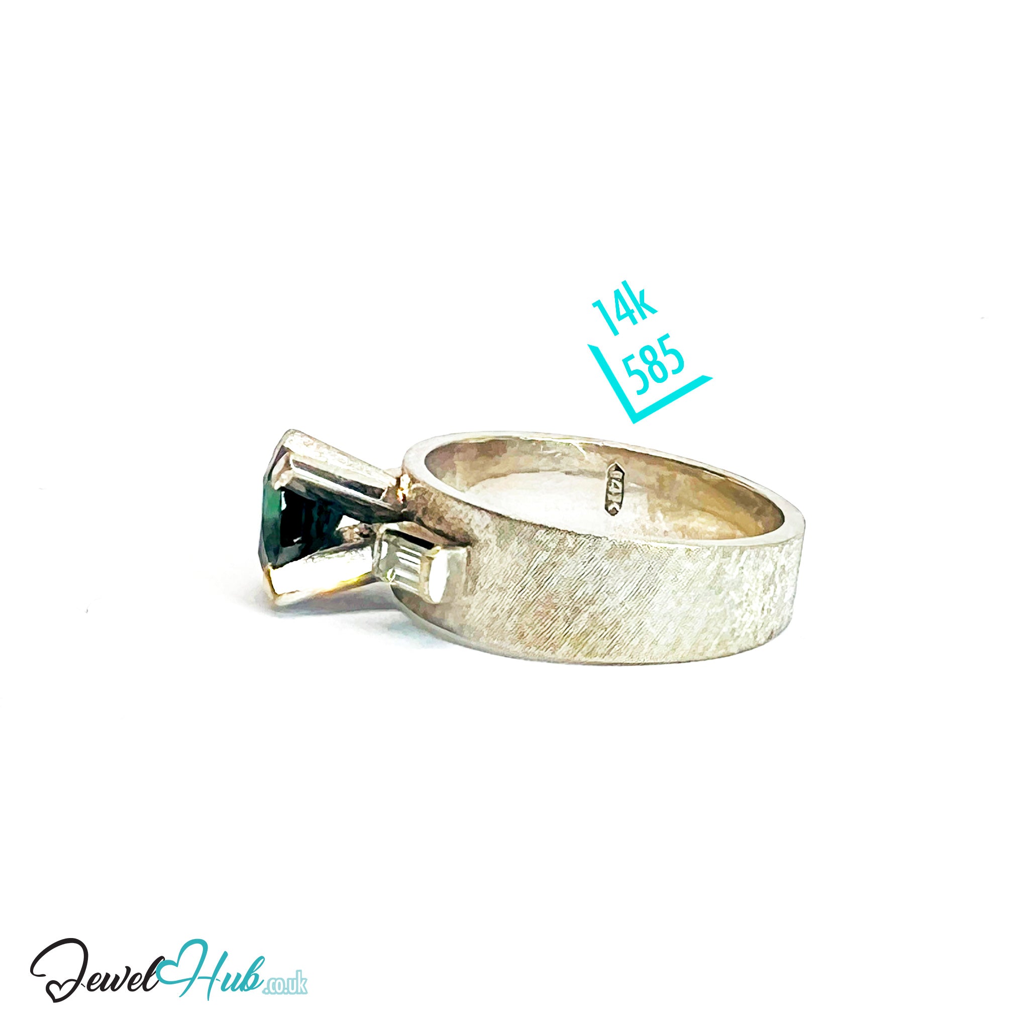 The Trio-Set Architectural Sapphire Diaming Ring crafted in 14K white gold, this sculptural piece features a deep blue sapphire measuring approx. 5.8 × 6.5 mm and weighing an estimated ~1.25 carats, prong-set to maximize brilliance and depth. Flanking the sapphire are 2 rectangular diamonds (3.5 × 2.5 mm each), estimated at ~0.24 carats total, adding geometric sparkle and balance to the design.