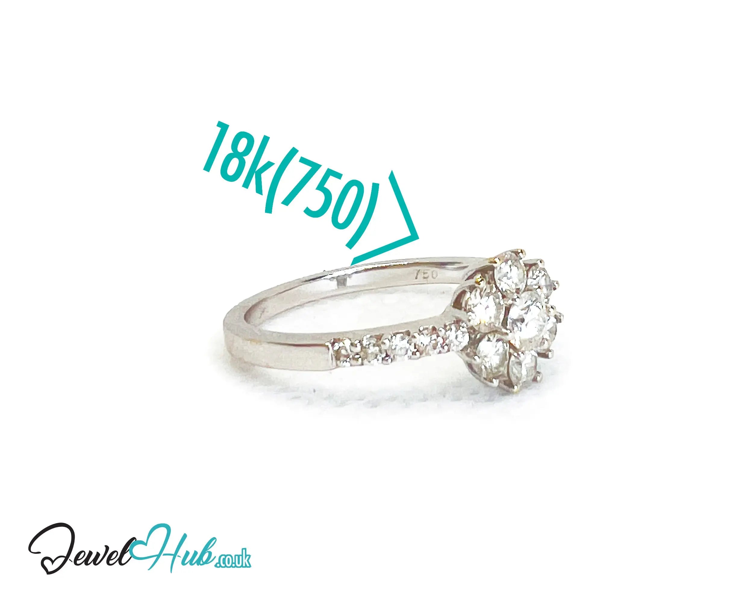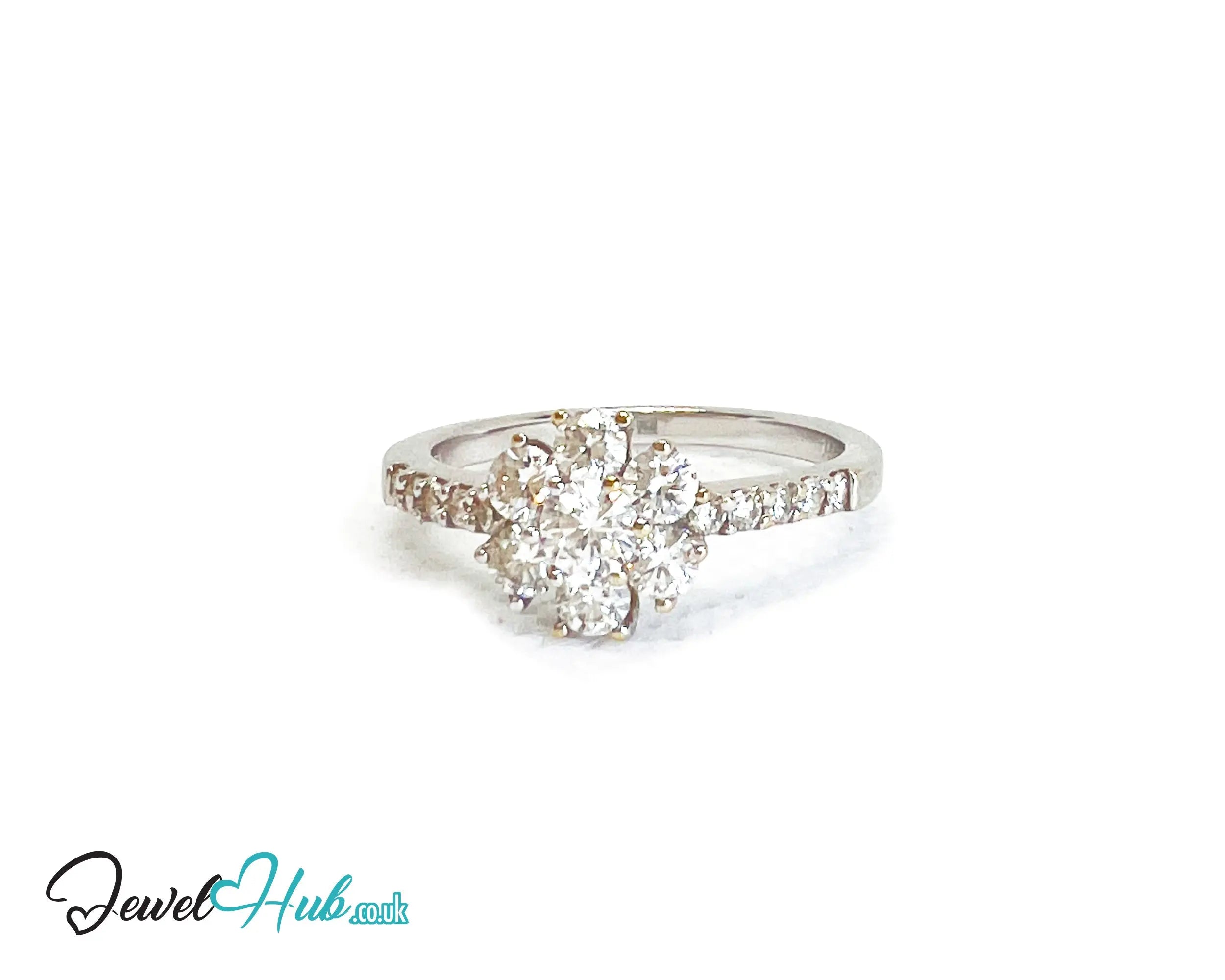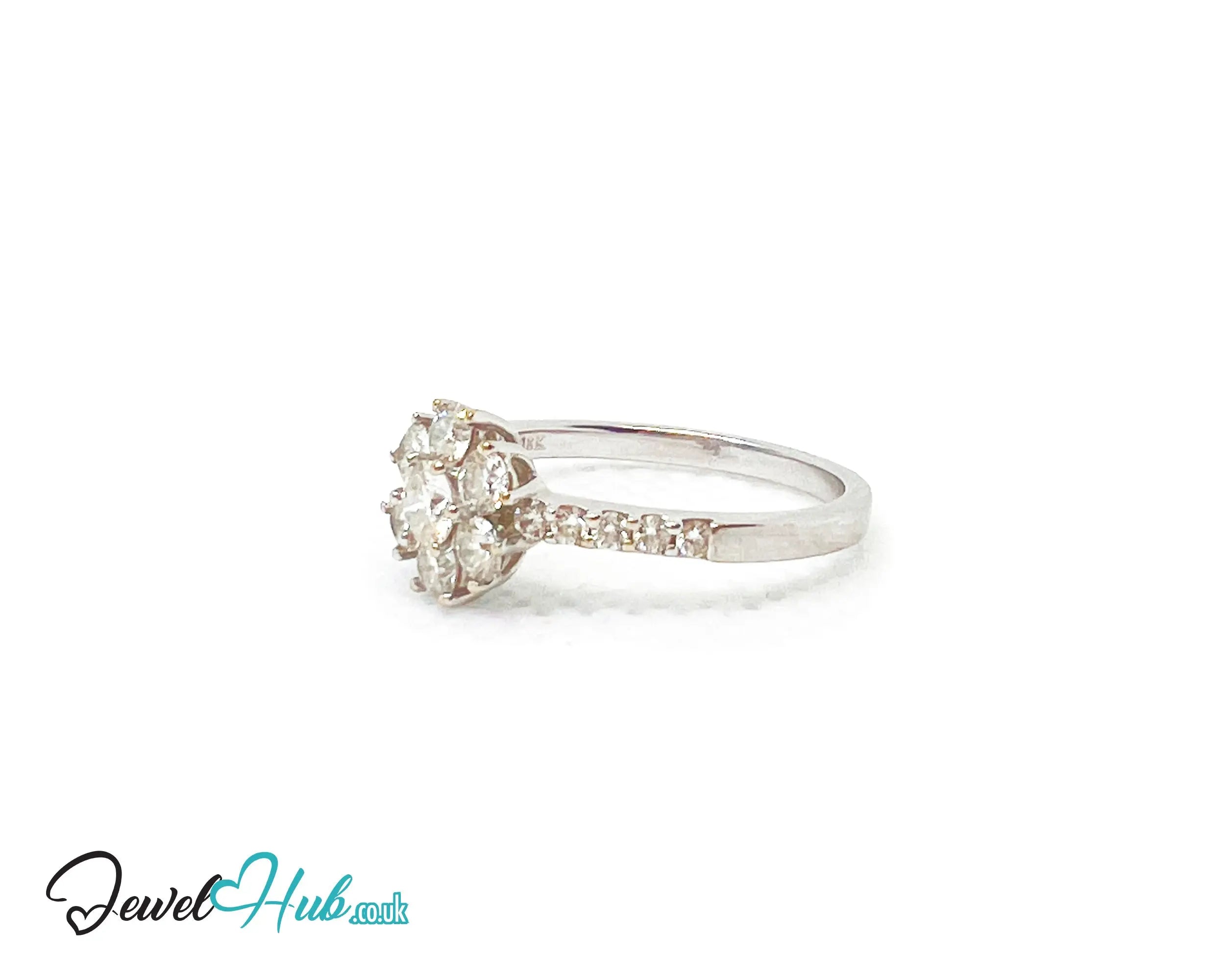 A garden of brilliance, captured in gold: This exquisite cluster ring is crafted from luminous 18k white gold and features a floral-inspired arrangement of brilliant-cut diamonds, totalling approximately 1.06–1.15 carats. The central 4 mm diamond radiates light, surrounded by six 3 mm stones and ten 1.6 mm accents—each catching light from every angle in perfect symmetry.