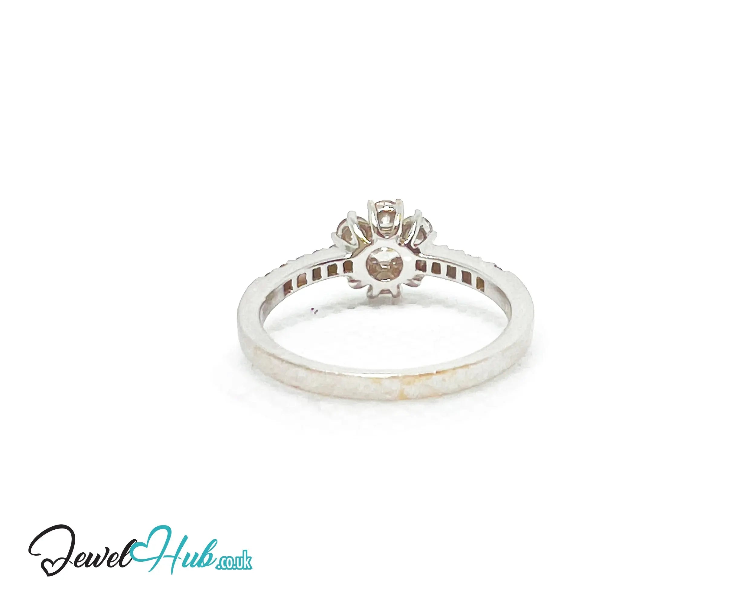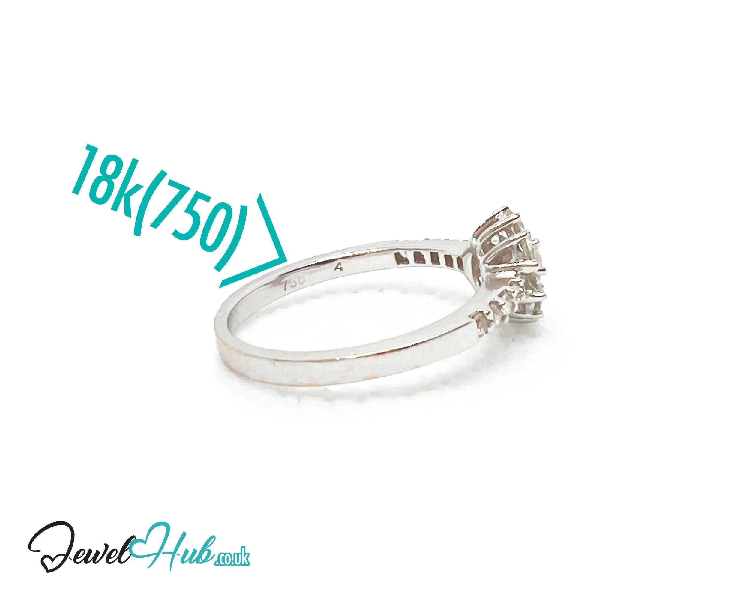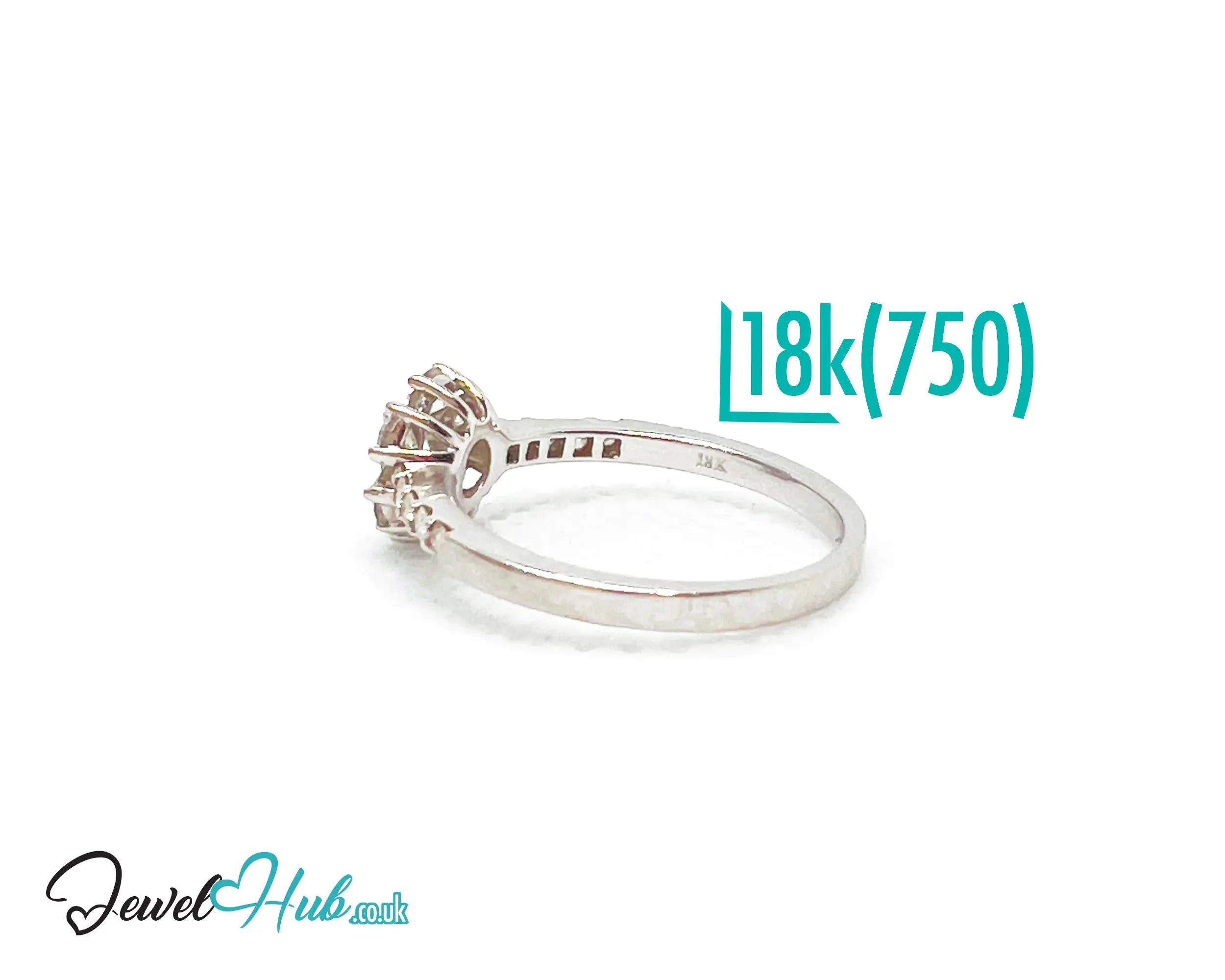 A garden of brilliance, captured in gold: This exquisite cluster ring is crafted from luminous 18k white gold and features a floral-inspired arrangement of brilliant-cut diamonds, totalling approximately 1.06–1.15 carats. The central 4 mm diamond radiates light, surrounded by six 3 mm stones and ten 1.6 mm accents—each catching light from every angle in perfect symmetry.