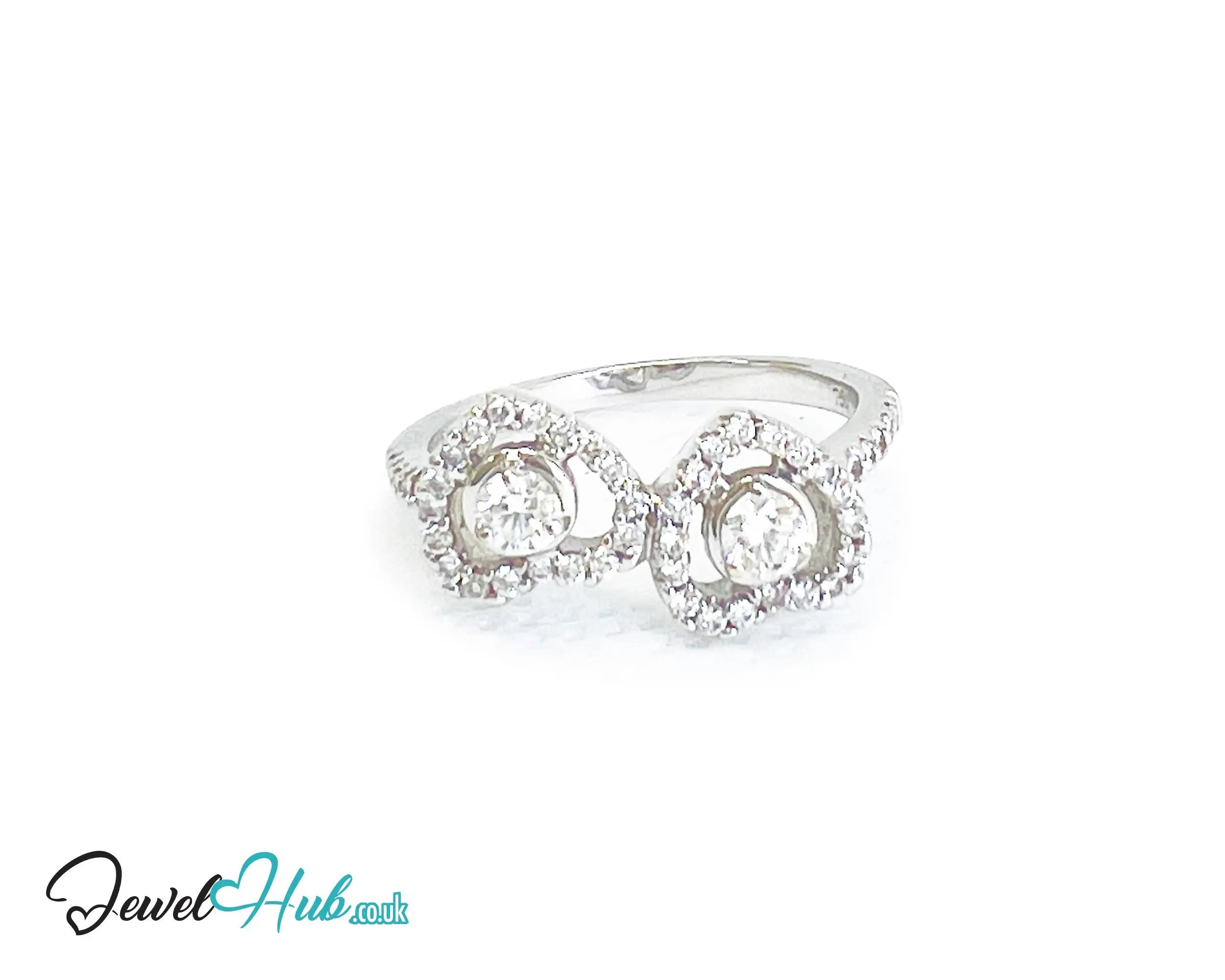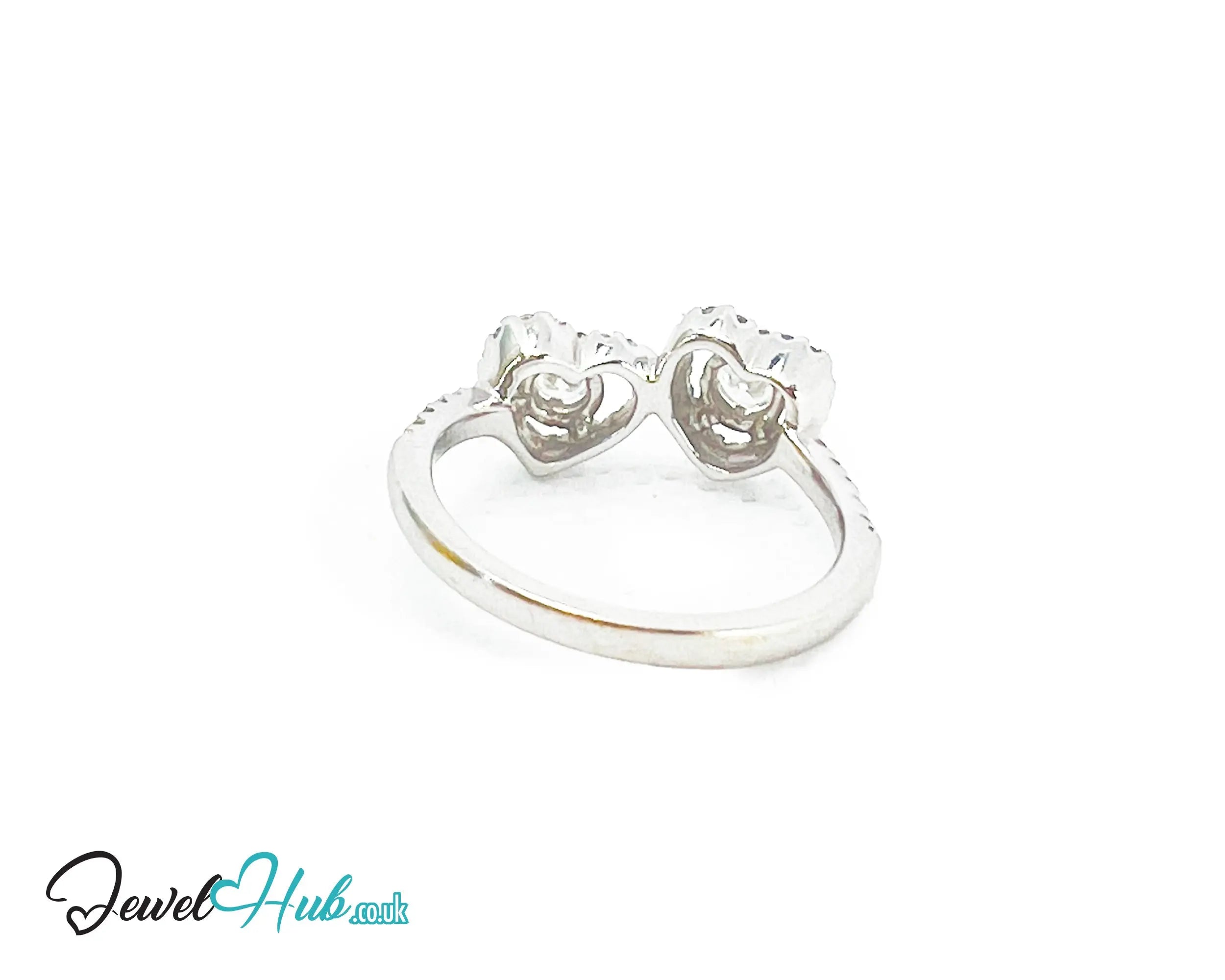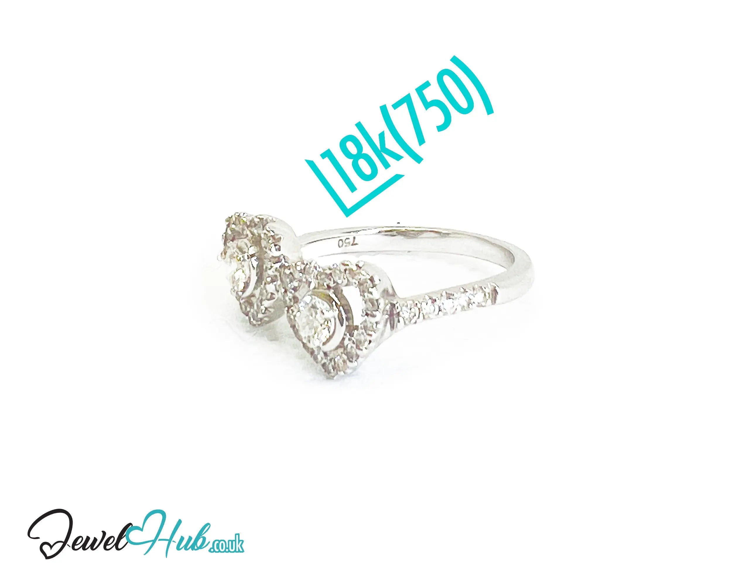Delicately crafted in solid 18k white gold and rhodium-finished for enduring shine, this romantic ring features a graceful double-heart motif illuminated by a constellation of round brilliant diamonds. At its centre, a 3 mm diamond (~0.11ct)anchors the design with a single point of light. Surrounding it, 36 finely set 1.2 mm diamonds trace the heart silhouette, while an additional 10 diamonds line the band for added brilliance.