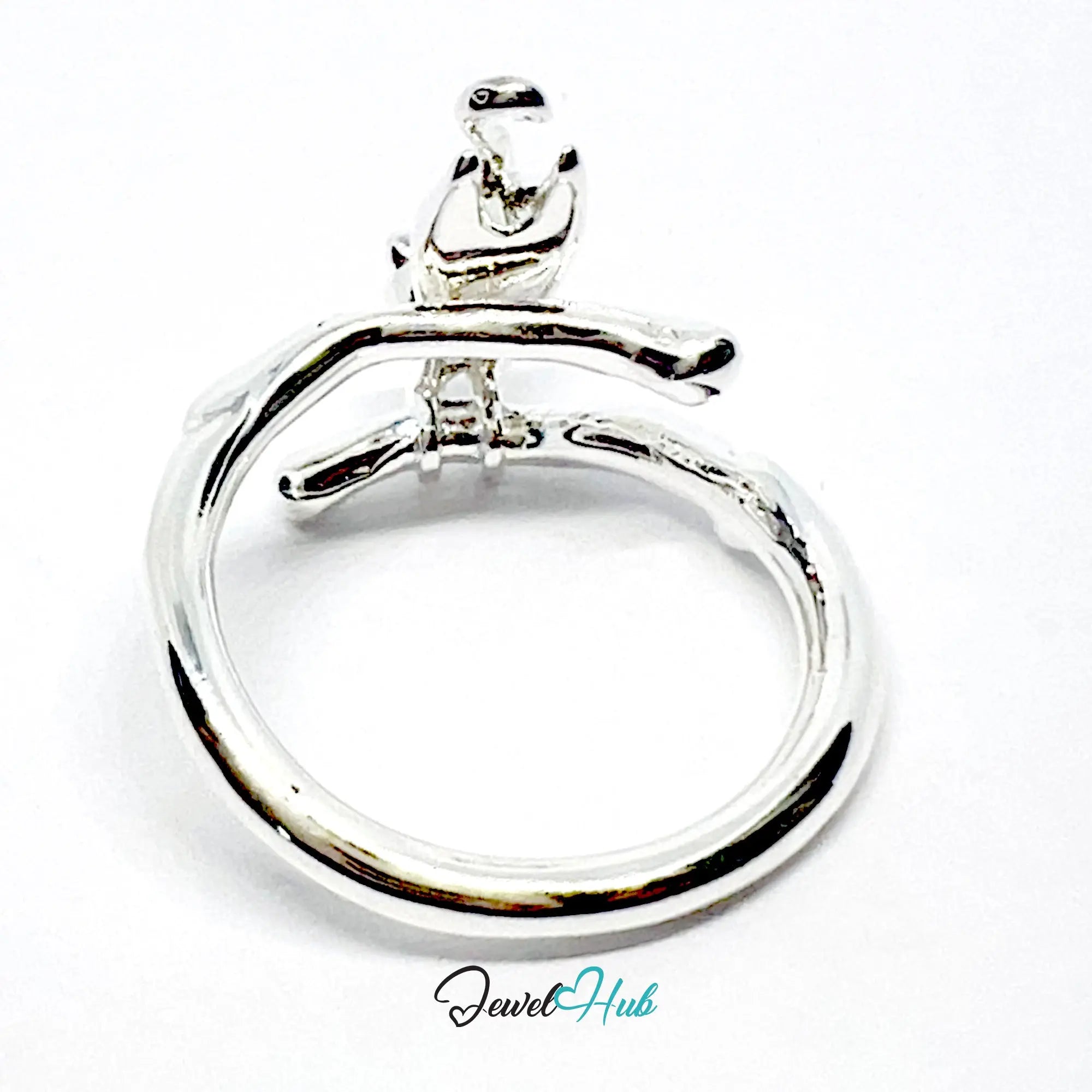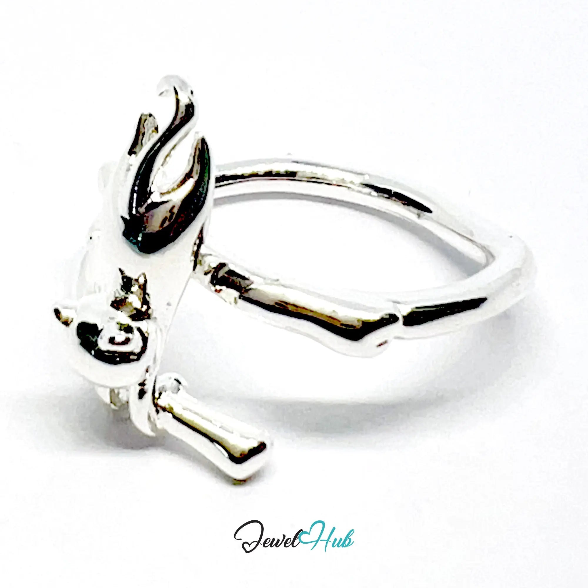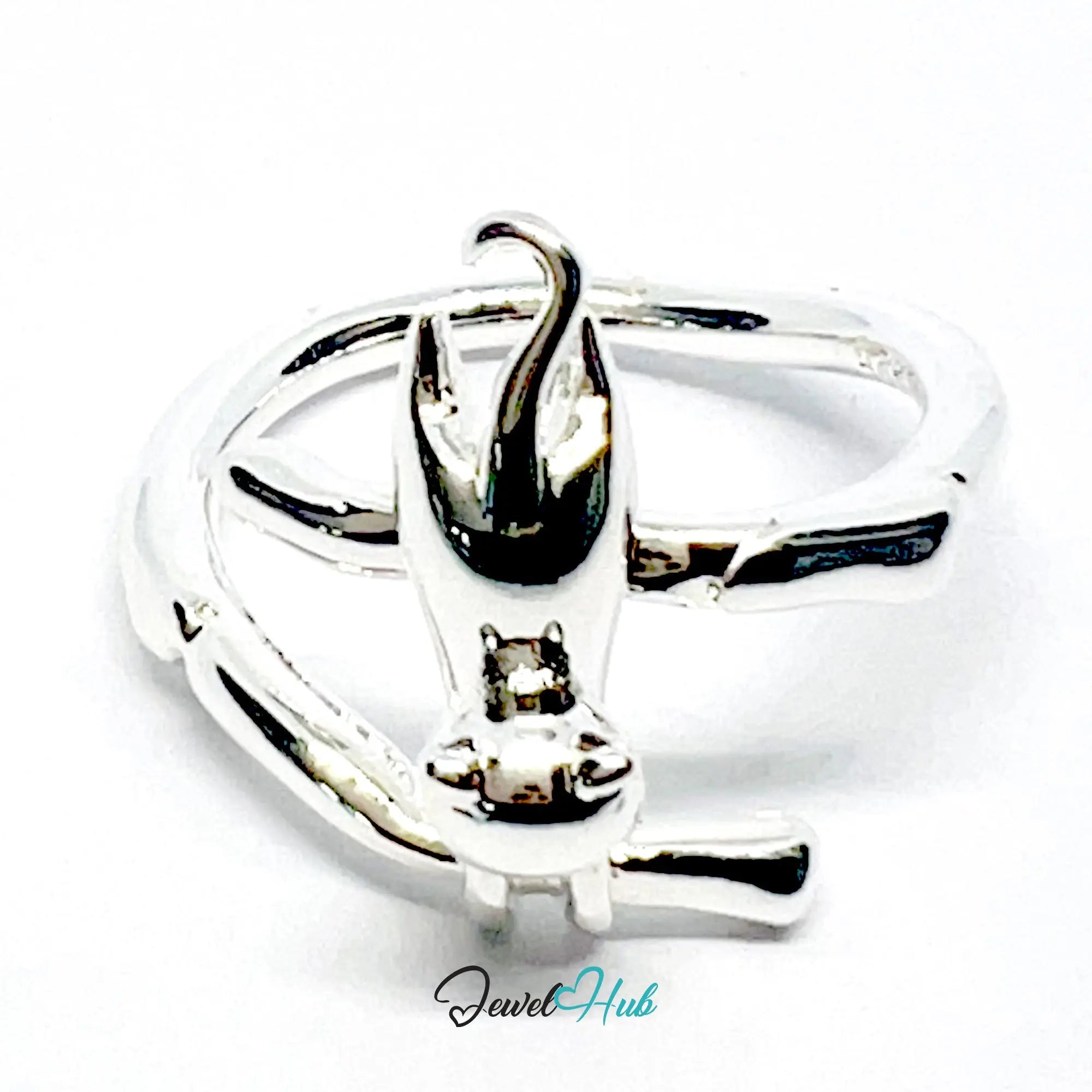 This hallmarked 925 silver ring features a sculptural cat motif—detailed, playful, and full of character. The polished figure sits atop a slim band, creating a miniature scene that evokes curiosity and charm. Adjustable across UK sizes M to O (US 6.5 to 8), it offers a secure fit with lightweight comfort.