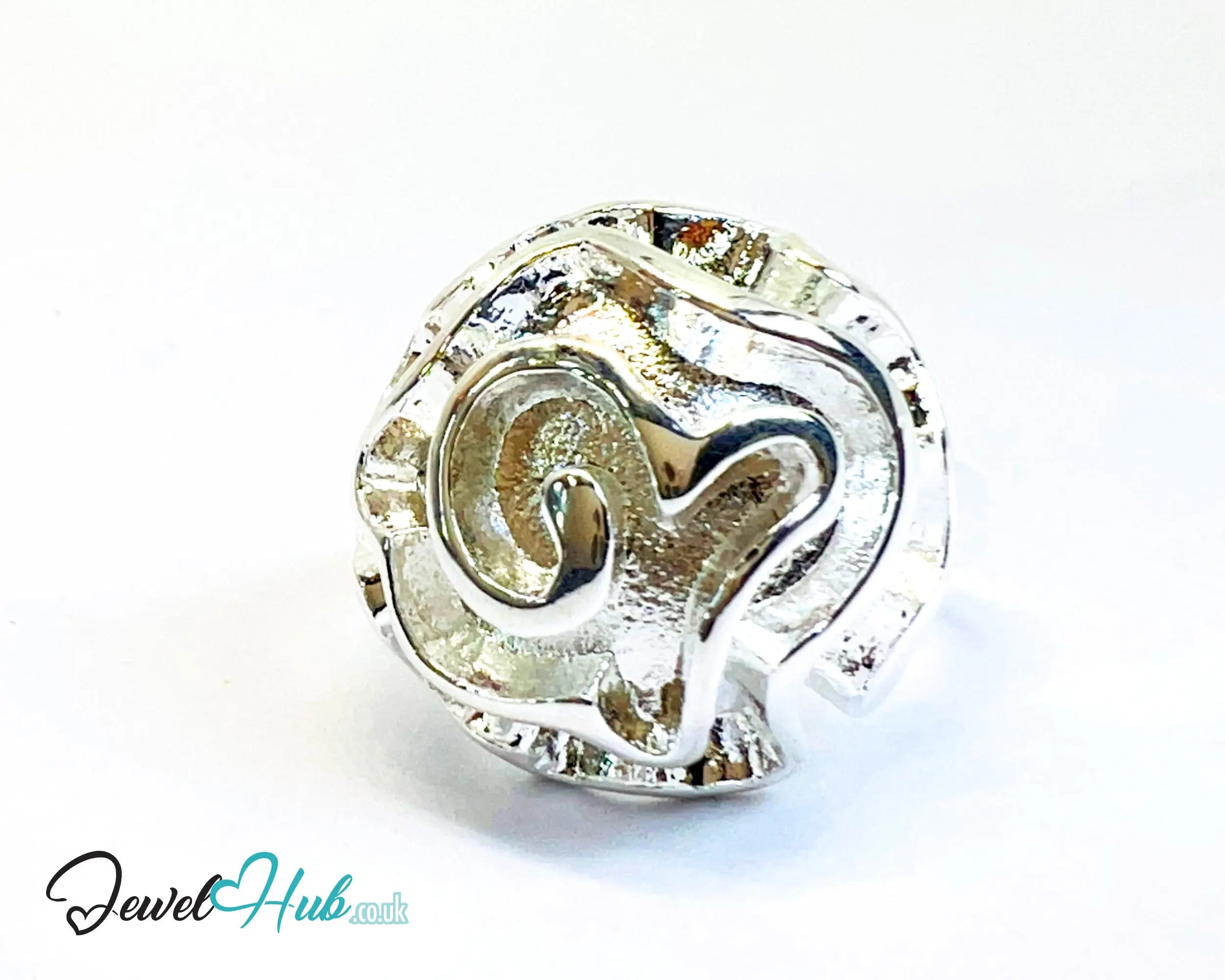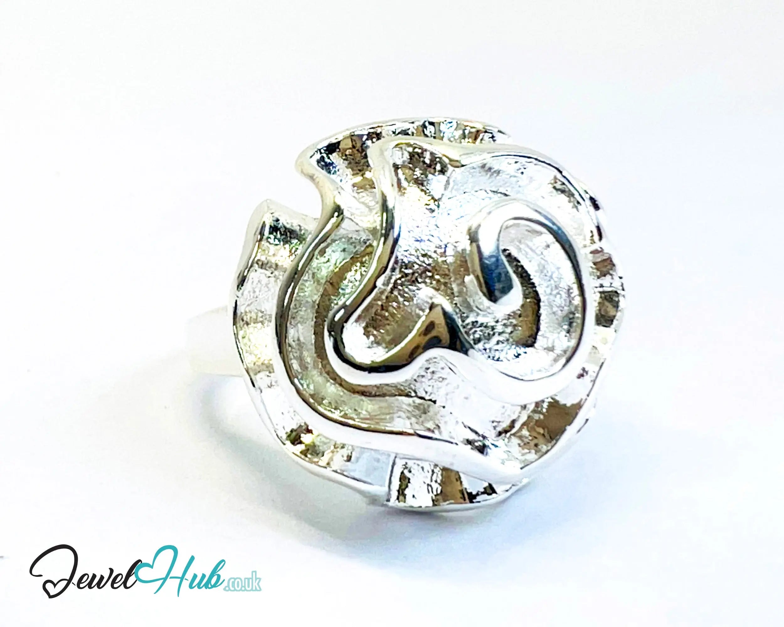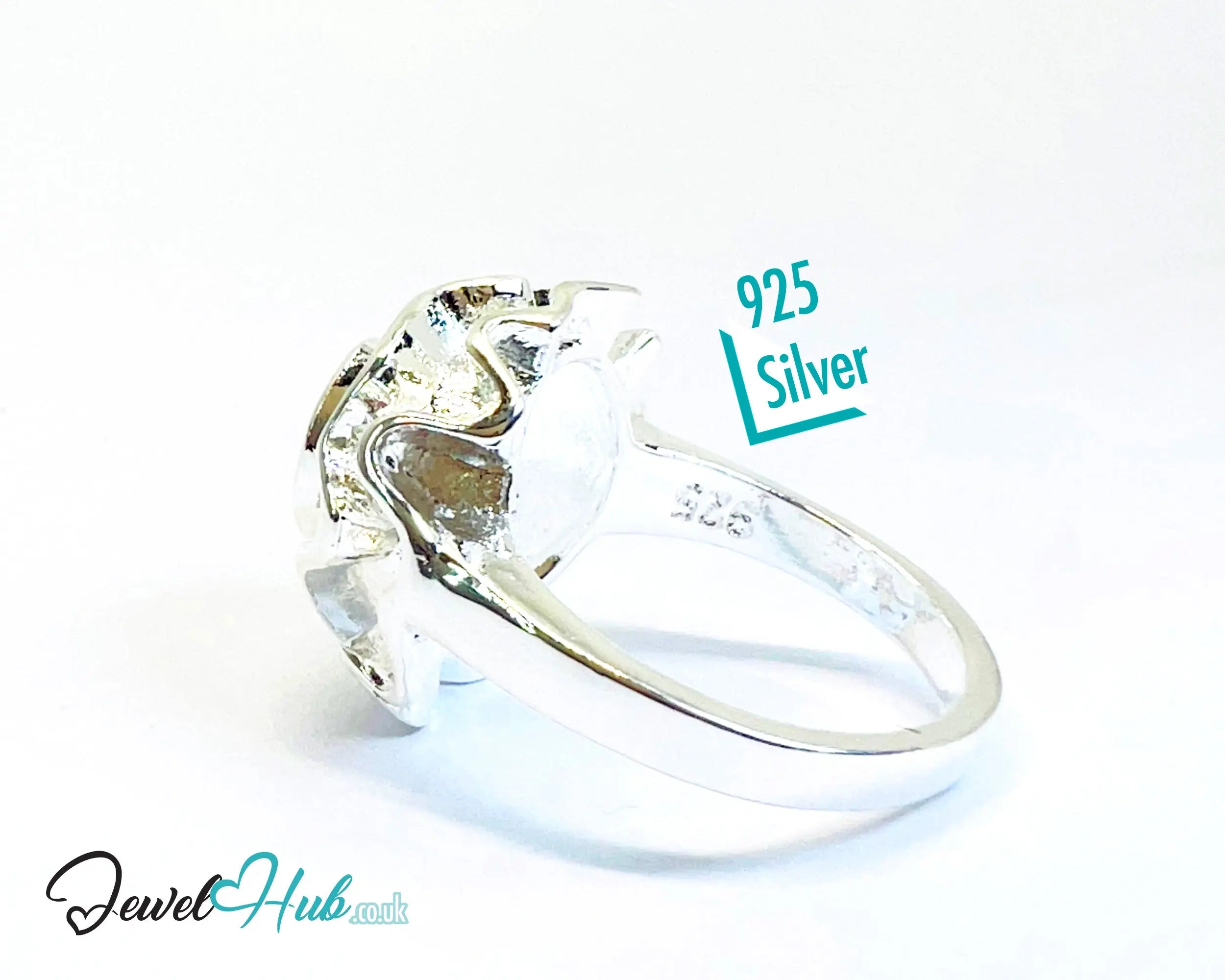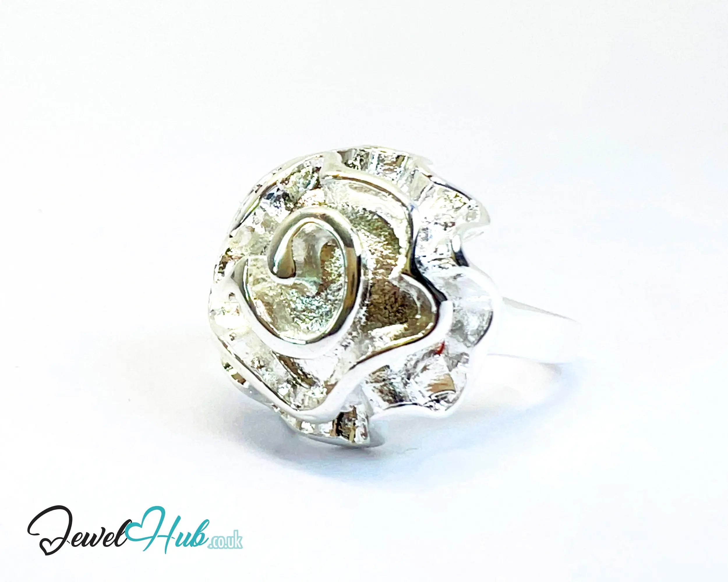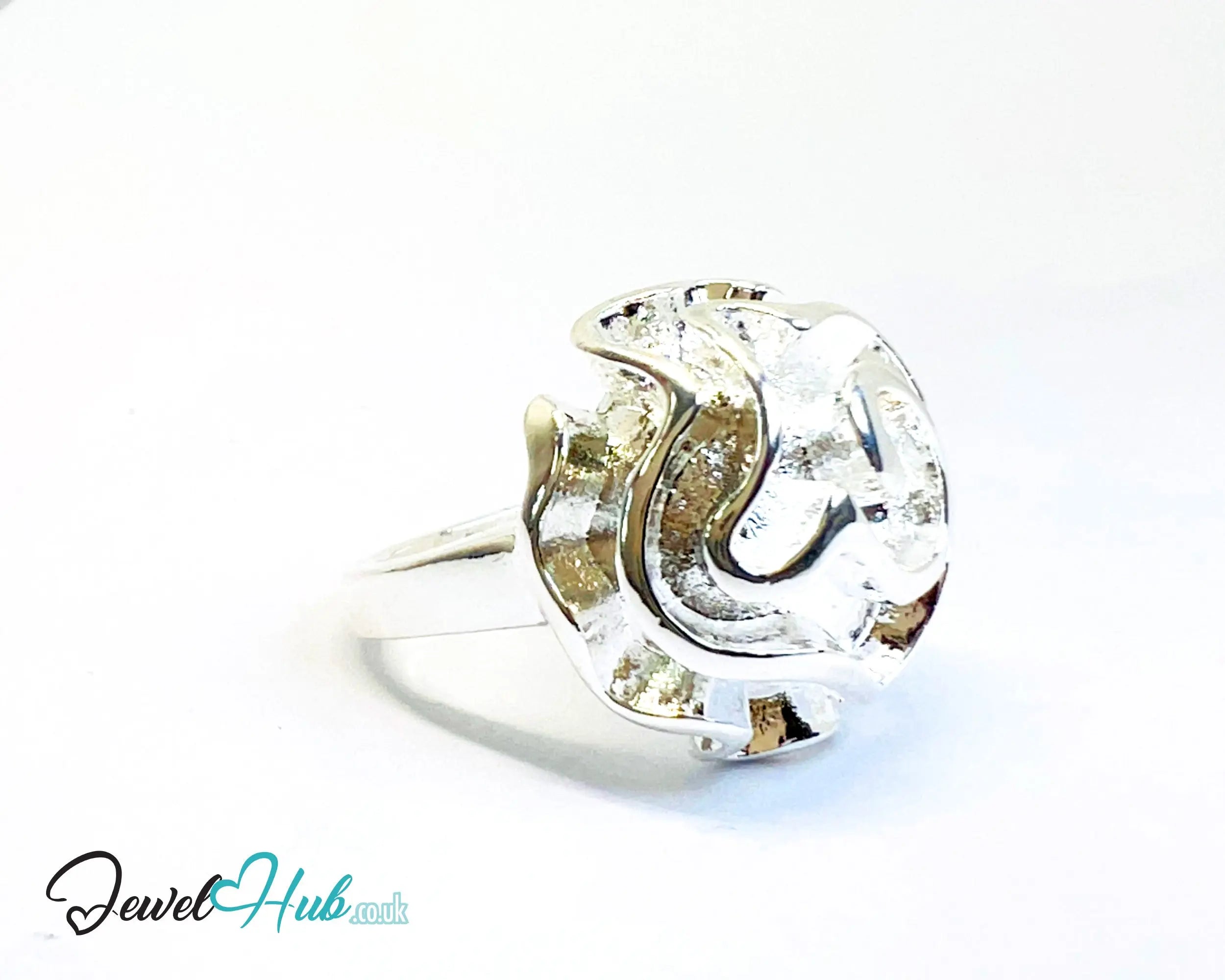 This hallmarked 925 sterling silver ring features a beautifully sculpted rose motif nestled within a wave-inspired band — a design that evokes both softness and motion. The swirling silver contours wrap around the finger like flowing petals caught in a breeze, creating a tactile and symbolic experience.