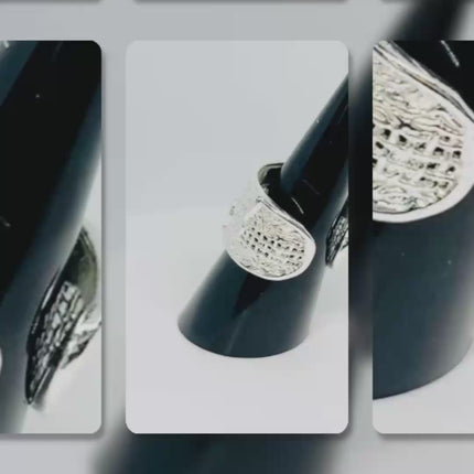 This hallmarked 925 silver ring features a woven crest design with intricate basket-like texture and organic detailing. The layered surface adds depth and tactility, while the polished finish enhances its dimensional shine. Adjustable across UK sizes O to Q (US 7.5 to 8.5), it offers a secure fit with sculptural presence.
