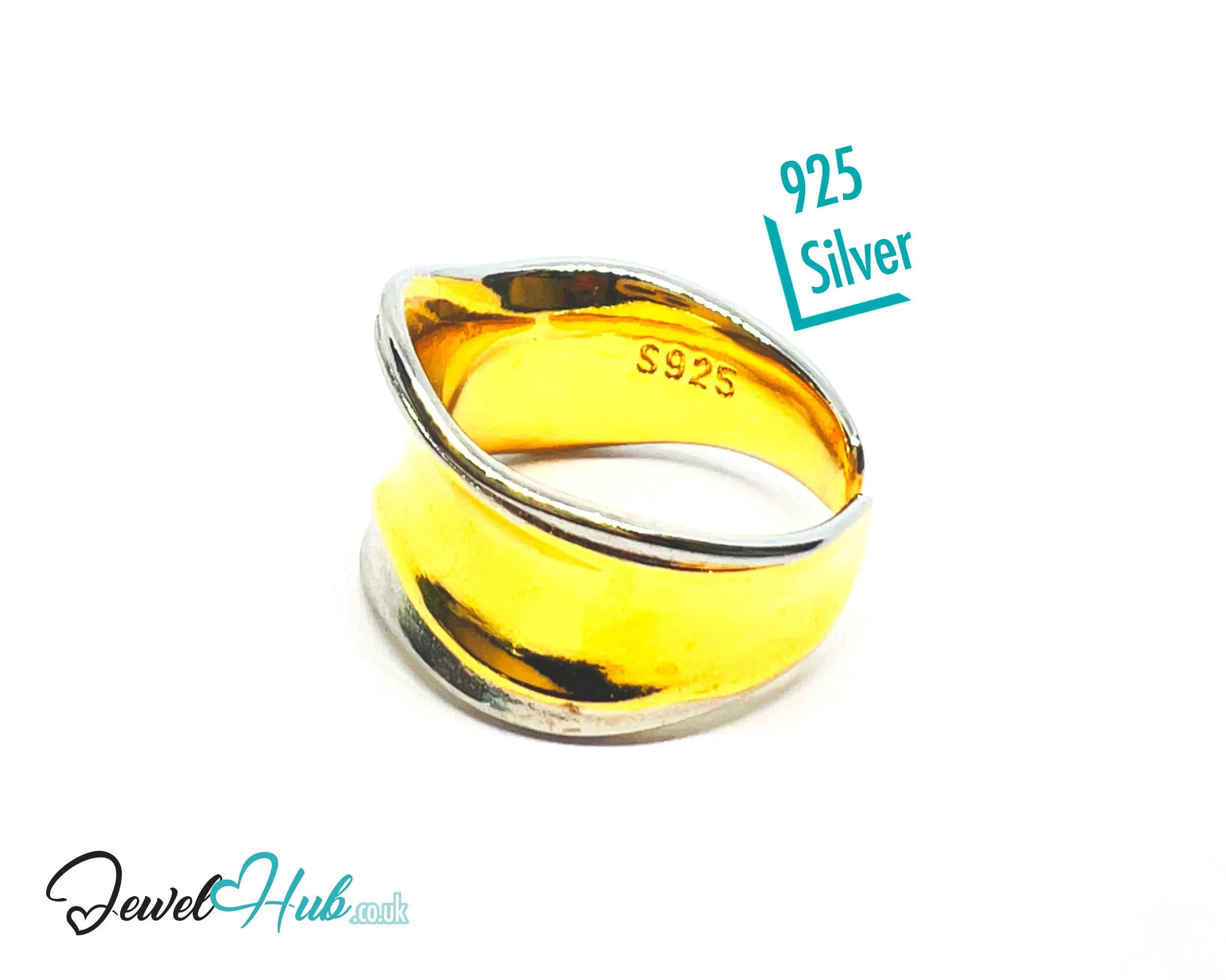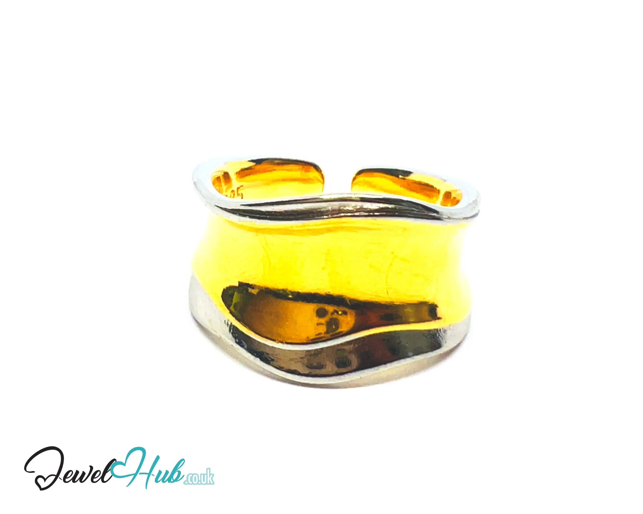 This hallmarked 925 sterling silver ring blends sculptural elegance with everyday versatility. Featuring a distinctive wavy silhouette, it showcases a polished gold-toned center framed by smooth silver edges—creating a golden silvery contrast that catches the light from every angle. With a weight of 6.3 grams and an adjustable fit from UK sizes N to P, it’s designed for comfort without compromising on style. Whether worn solo or stacked, this piece adds a refined edge to any look.