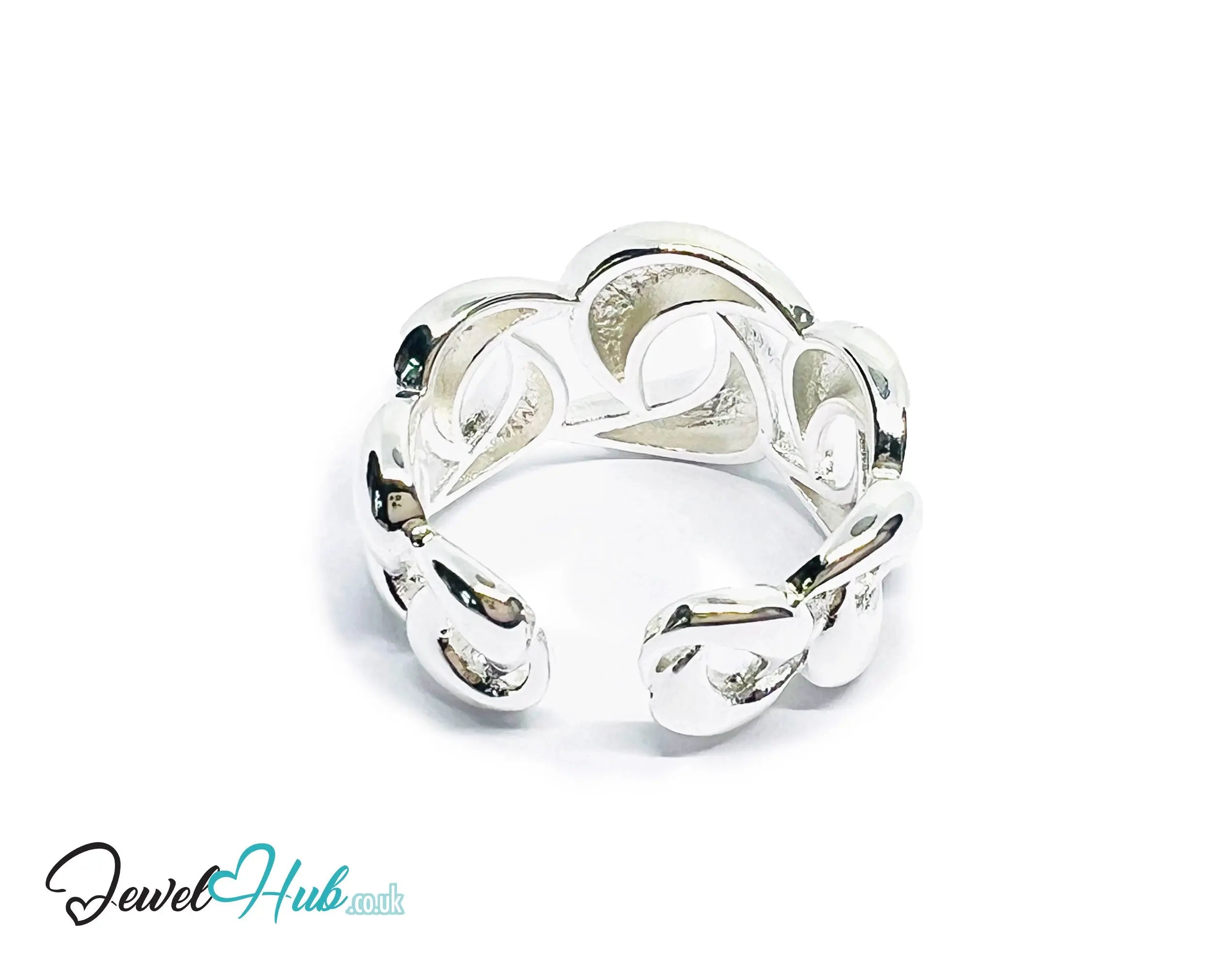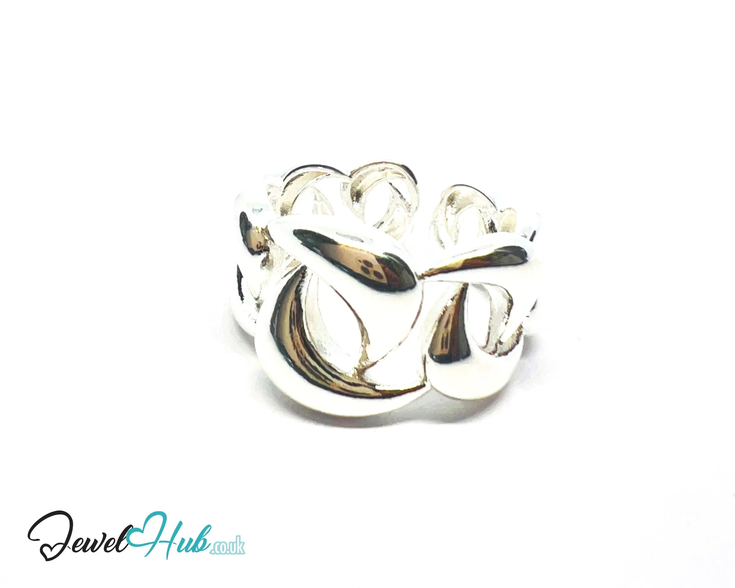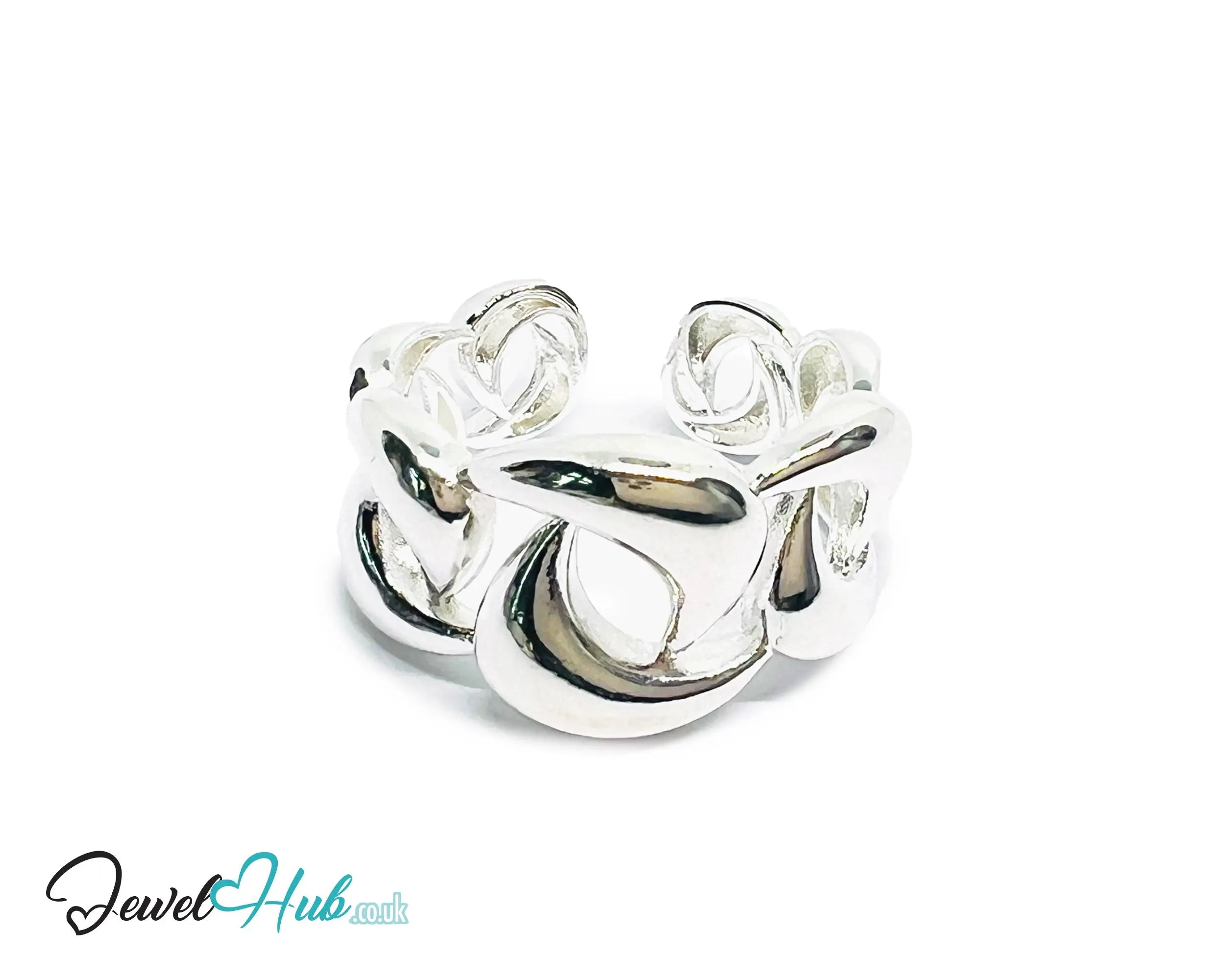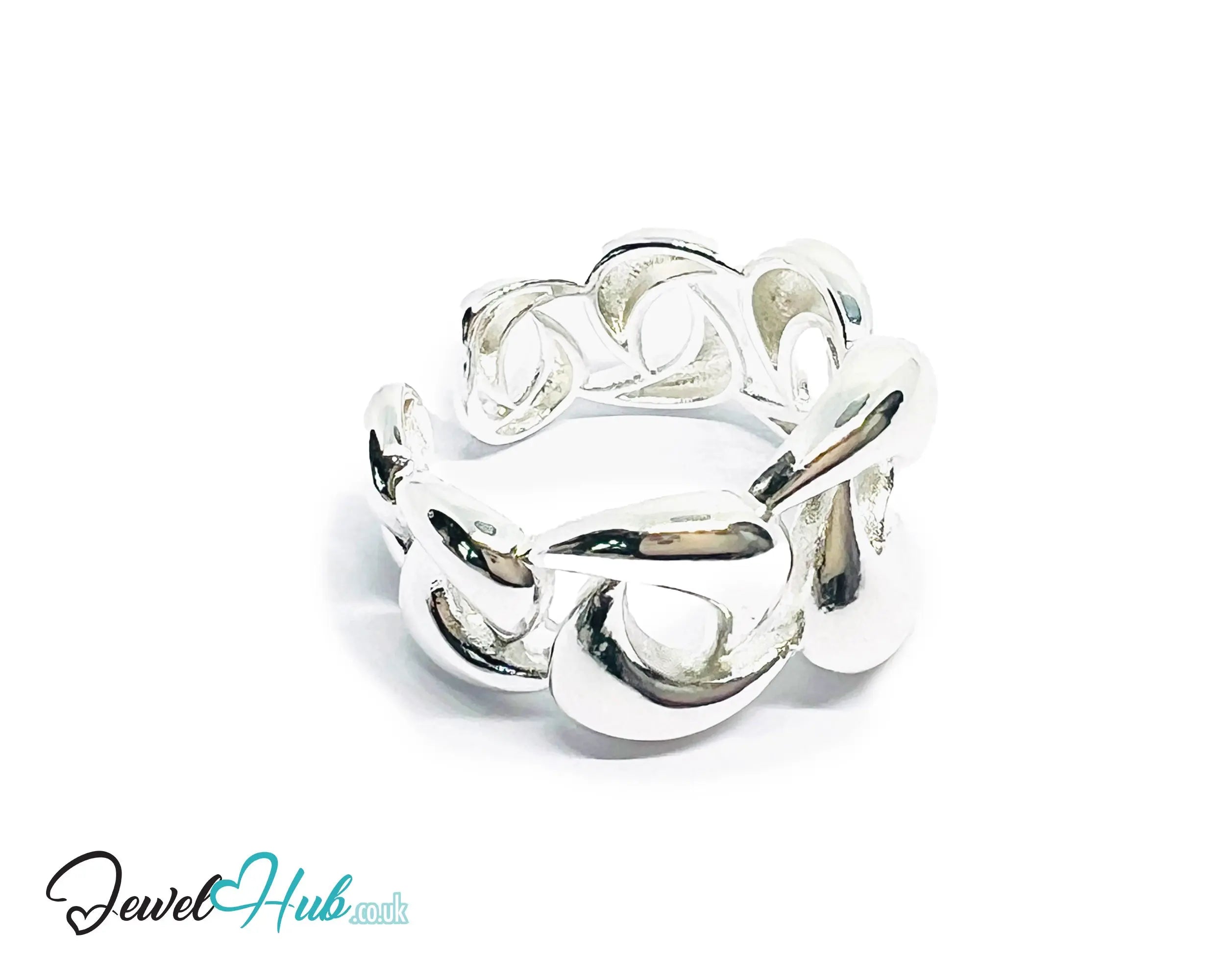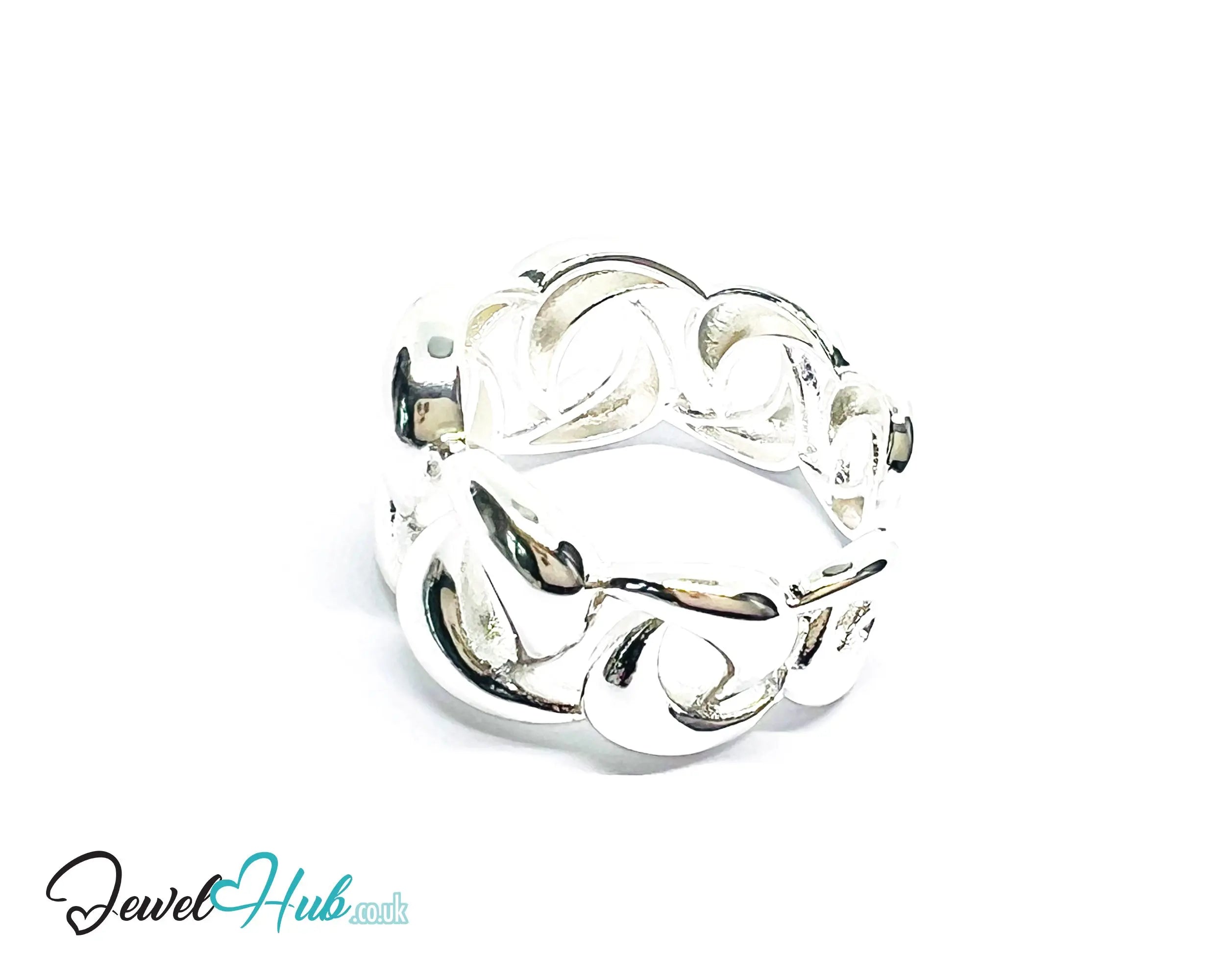 This hallmarked 925 chunky silver ring features a bold interlocking chain design, sculpted for maximum impact and everyday wearability. Weighing 6.4 grams, its polished surface and fluid structure create a confident silhouette that wraps the finger in modern texture. The open-link form adds depth and movement, making it a standout piece for those who favour bold simplicity.