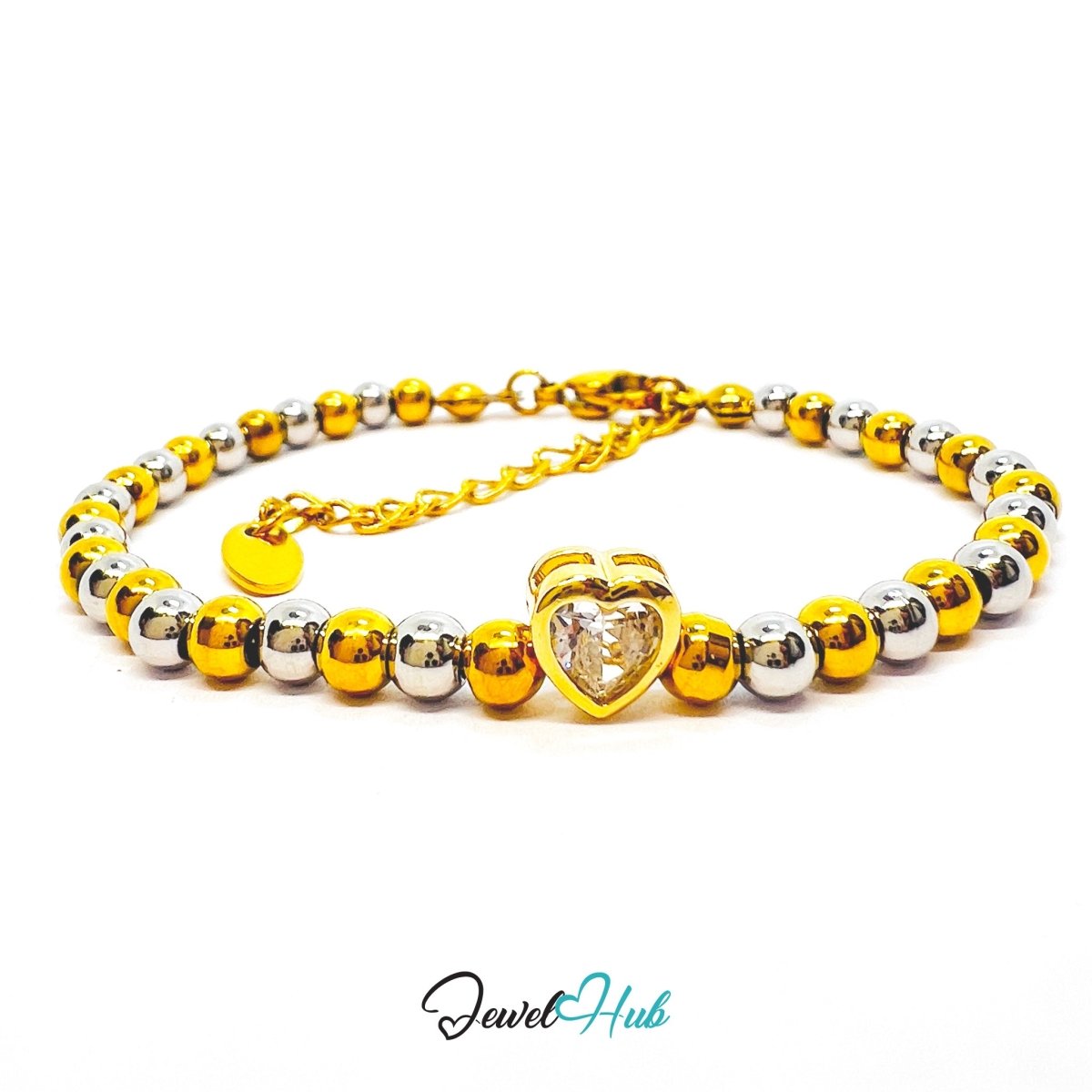 This bracelet blends the playful charm of NameBead-style jewellery with the refined metallic elegance of 316L stainless steel. The alternating gold and silver beads echo youthful curiosity, while the heart zirconia adds a touch of emotional sparkle.