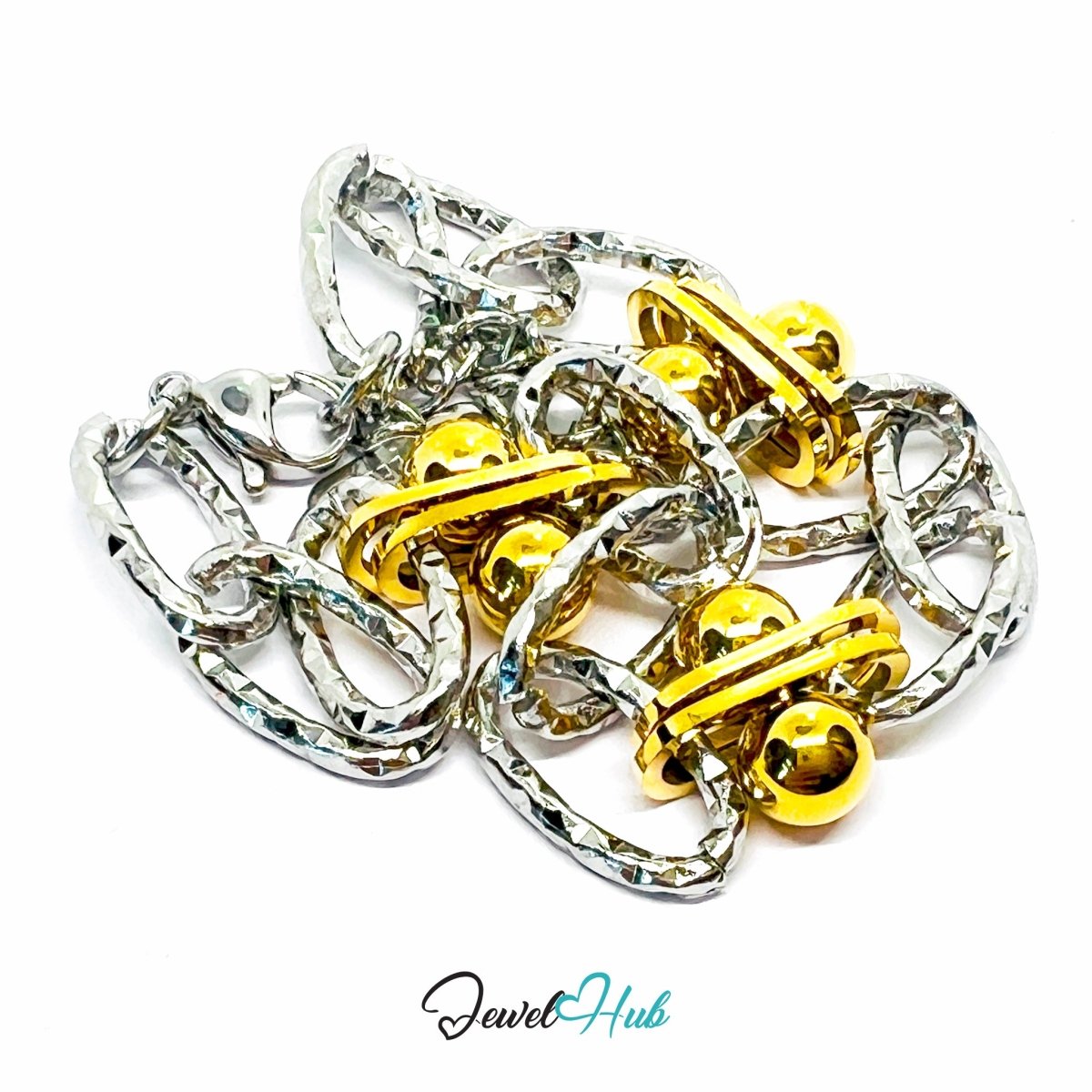 This 15.2g DuoTone bracelet features chunky silver chain links punctuated by polished gold-tone double spheres, creating a bold, sculptural rhythm. The 18–20cm adjustable length ensures a secure fit, while the 12mm gold spheres add dimensional contrast and shine. Crafted from 316L stainless steel with gold-plated accents, this piece resists tarnish and maintains its brilliance.