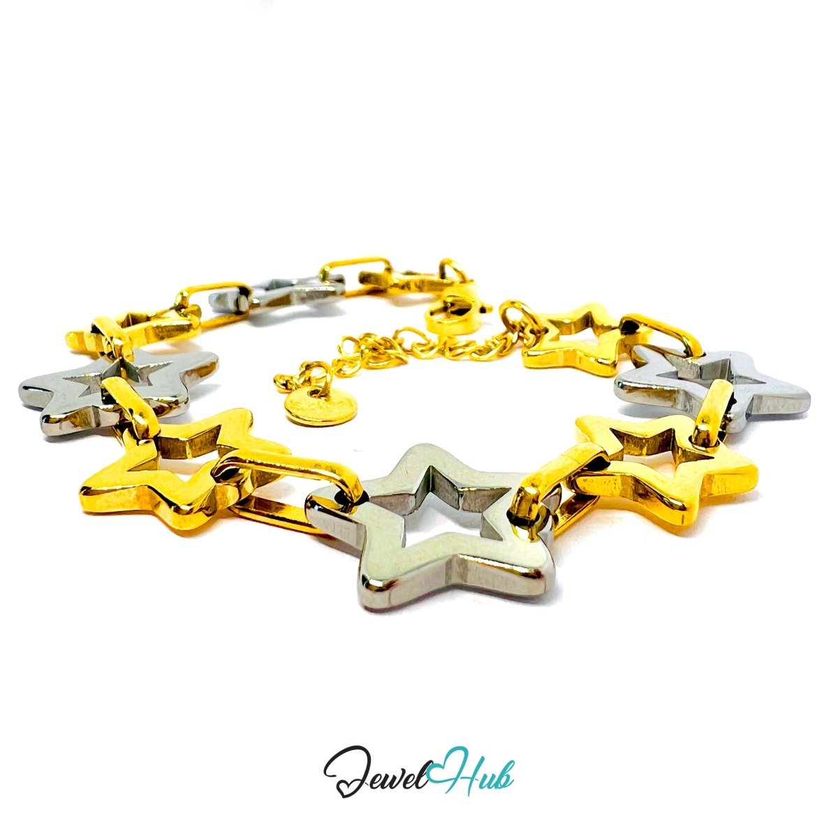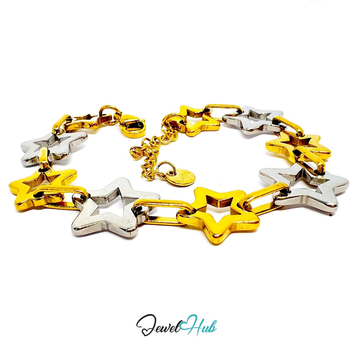 This 13.86g DuoTone bracelet features alternating gold and silver hollow star links, each connected by polished rectangular connectors for a clean, rhythmic flow. The largest silvery star measures 15mm across, anchoring the design with sculptural presence. Its 18–20cm adjustable length ensures a flexible fit, while the mix of tones and shapes adds playful contrast.