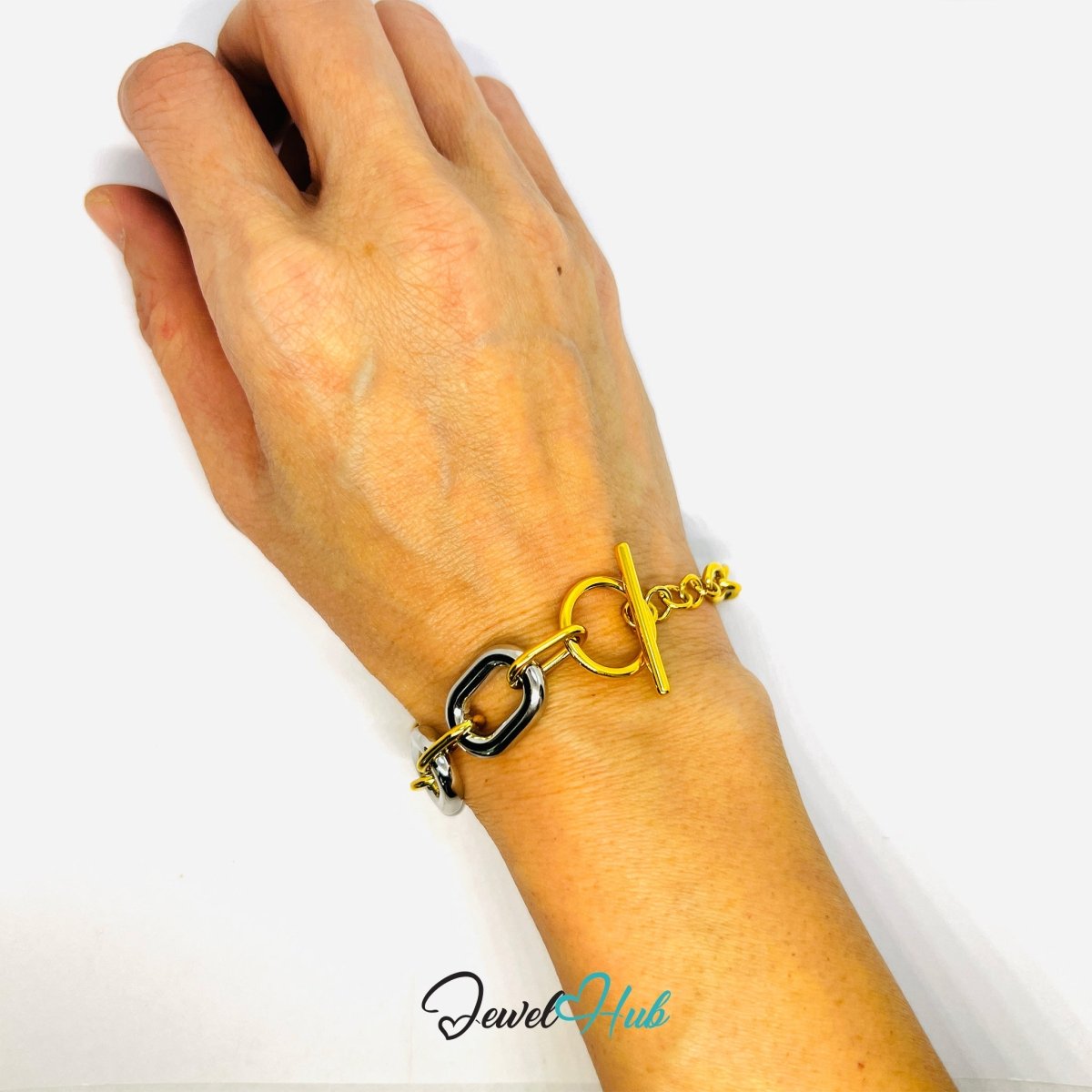 This bracelet blends geometric boldness with DuoTone elegance. The oversized silver links create a clean, architectural rhythm, while the gold-toned connectors add warmth and contrast.