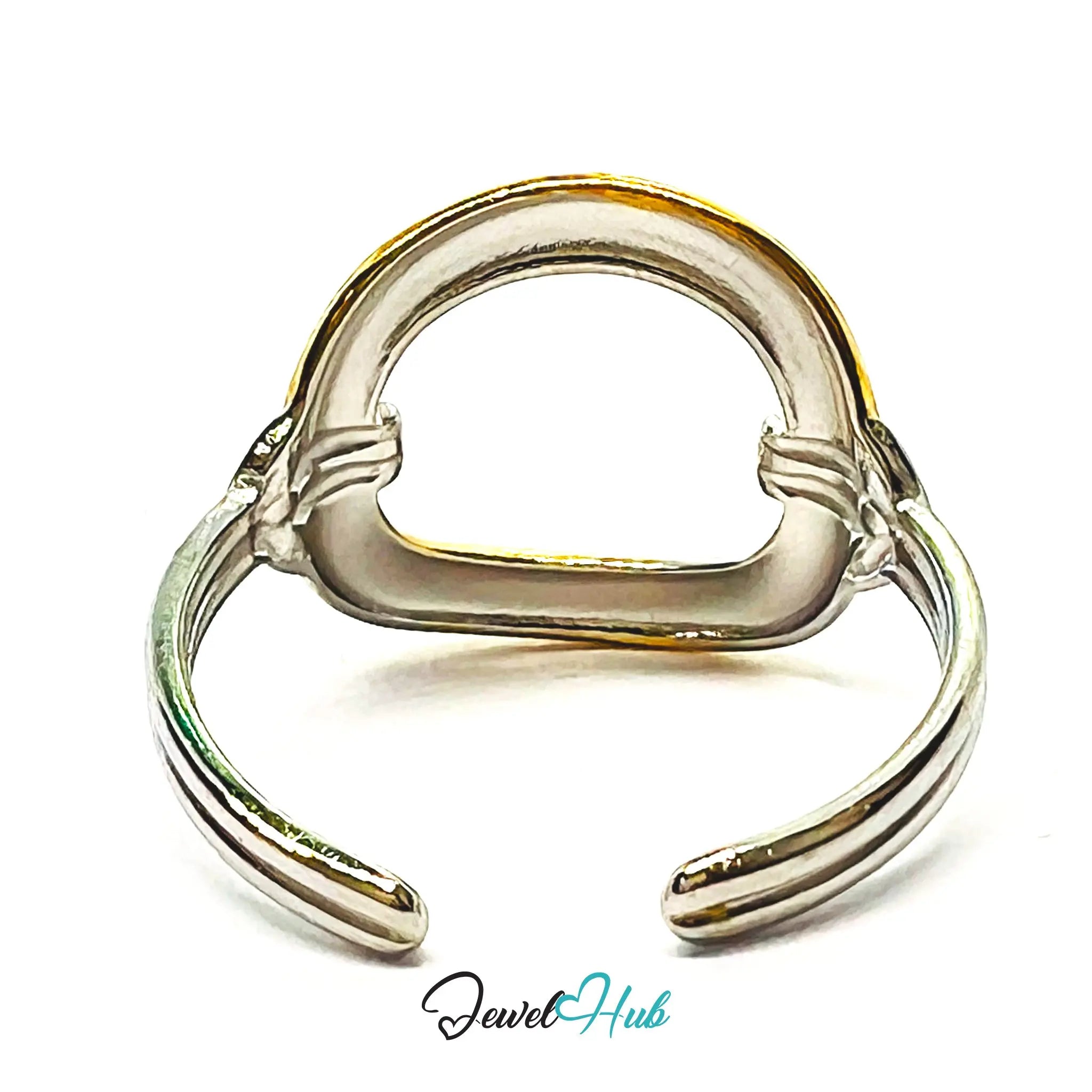 A sculptural two‑tone statement, this adjustable stainless steel ring pairs a polished silver‑tone band with warm gold‑tone buckle and horseshoe accents. At just 1.67 g, it’s feather‑light yet visually bold, perfect for all‑day comfort and stacking. The OPQ adjustability lets you fine‑tune fit across ring and index fingers, making styling fluid and precise. Two‑tone is a leading trend because it blends cool and warm metals in one piece—pair it with denim for casual edge, or with tailored looks for clean contrast. Wear it solo for sculptural focus, or stack with slim bands to echo the mixed‑metal rhythm. Waterproof and tarnish‑resistant appeal supports effortless, everyday rotation with modern polish.