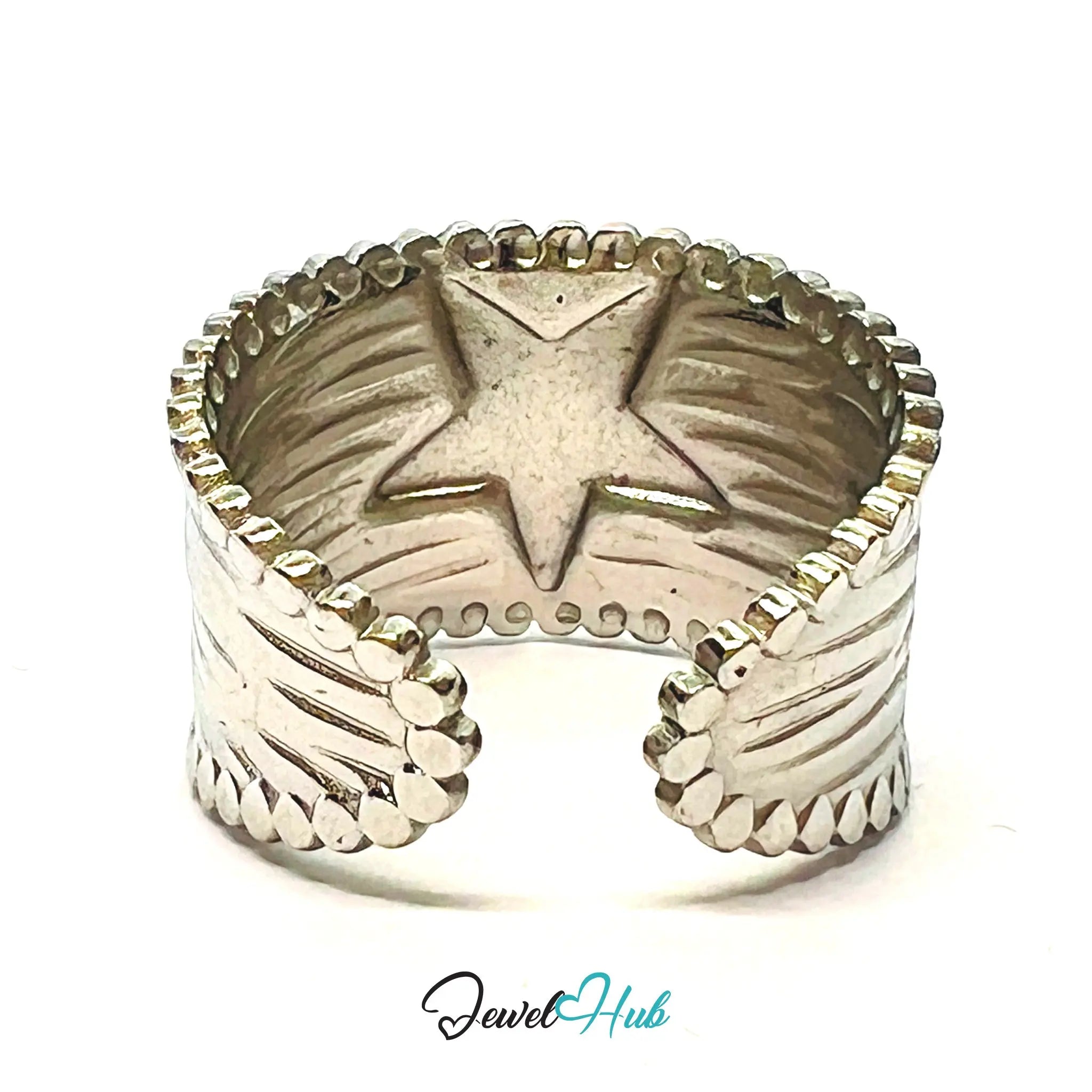 Pair with slim silver bands or star‑themed charms to echo the motif, or wear solo for symbolic impact. The raised star and textured finish make it a versatile statement — radiant, modern, and emotionally resonant.