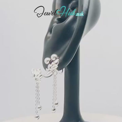 Designed to shimmer from every angle, the Echo Bloom earrings are a contemporary twist on classic florals. Crafted in solid 925 sterling silver, each earring features a sculpted flower stud with a polished silver ball at its centre — but the magic happens at the back. Delicate twin chains extend behind the lobe, finished with subtle silver spheres that move gently as you do. Lightweight at 2.51g per pair, they bring a layered silhouette that frames the jawline and elevates any look.