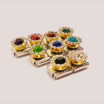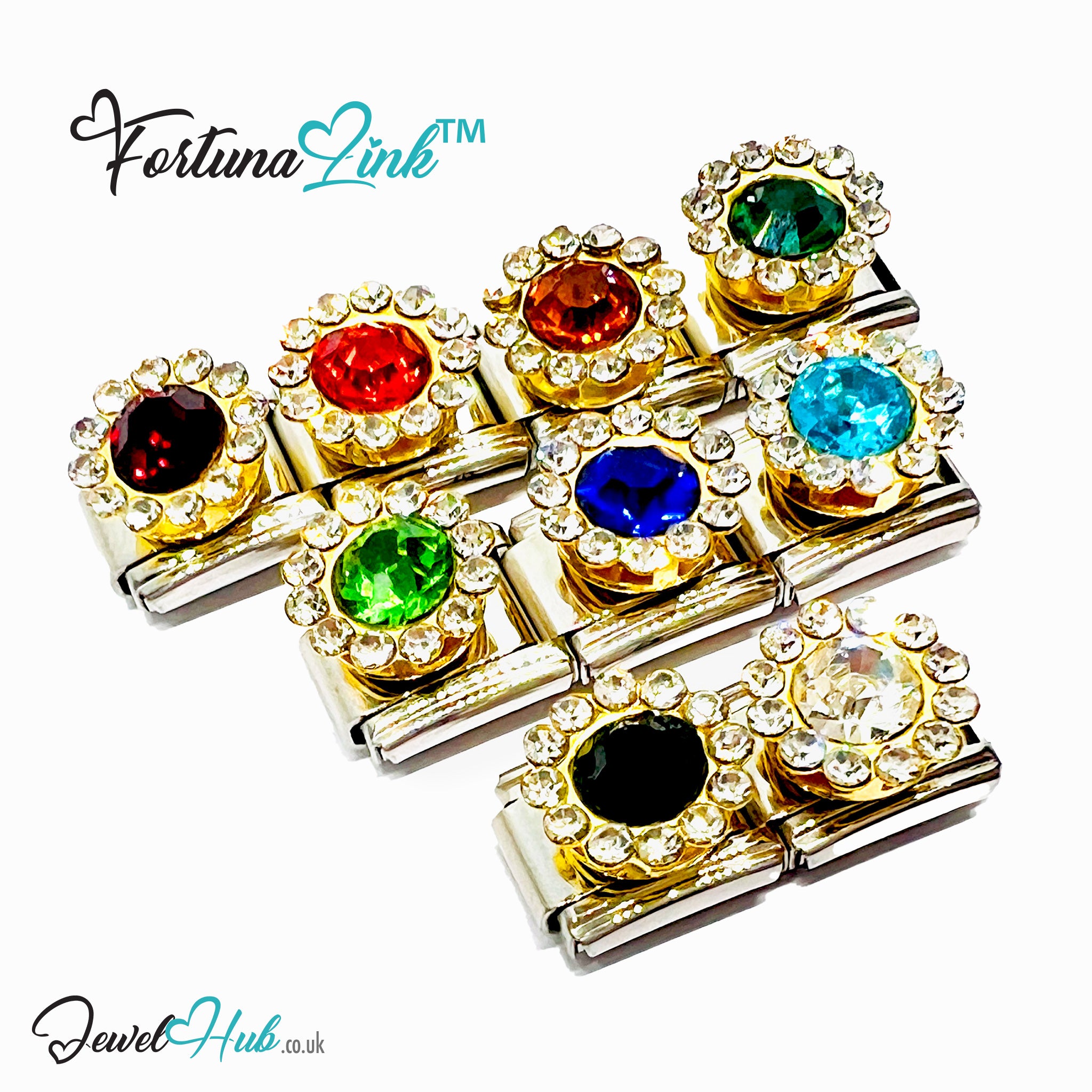 Each FortunaLink™ gemstone charm features a central coloured crystal surrounded by a halo of clear rhinestones, set in a gold-tone bezel atop polished stainless steel. Measuring 10mm (width) × 9mm (height), these modular links are compatible with standard Italian charm bracelets and designed to add sparkle, symbolism, and emotional resonance to your daily stack. Choose from nine radiant colours—Dark Red, Red, Orange, Dark Green, Light Green, Dark Blue, Cyan, Black, and White—each selected for its energetic qualities and visual impact. Whether worn solo or layered with message tiles and symbol charms, these crystal accents bring light and intention to your bracelet.