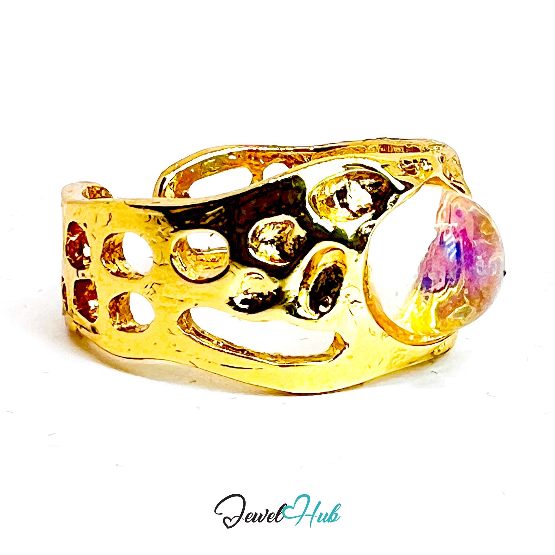 This gold-plated zinc alloy ring is a sculptural blend of warmth and modern design. Weighing 3.8 grams and available in open-end sizing for R and S, it features a translucent amber resin gem that glows with rich, honey-toned warmth. The wide openwork band is punctuated by irregular geometric holes—oval, oblong, and asymmetrical—creating a lace-like structure that feels both organic and architectural. The polished gold plating adds contrast and radiance, while the amber resin offers a soft, luminous focal point that catches light like captured sunlight.