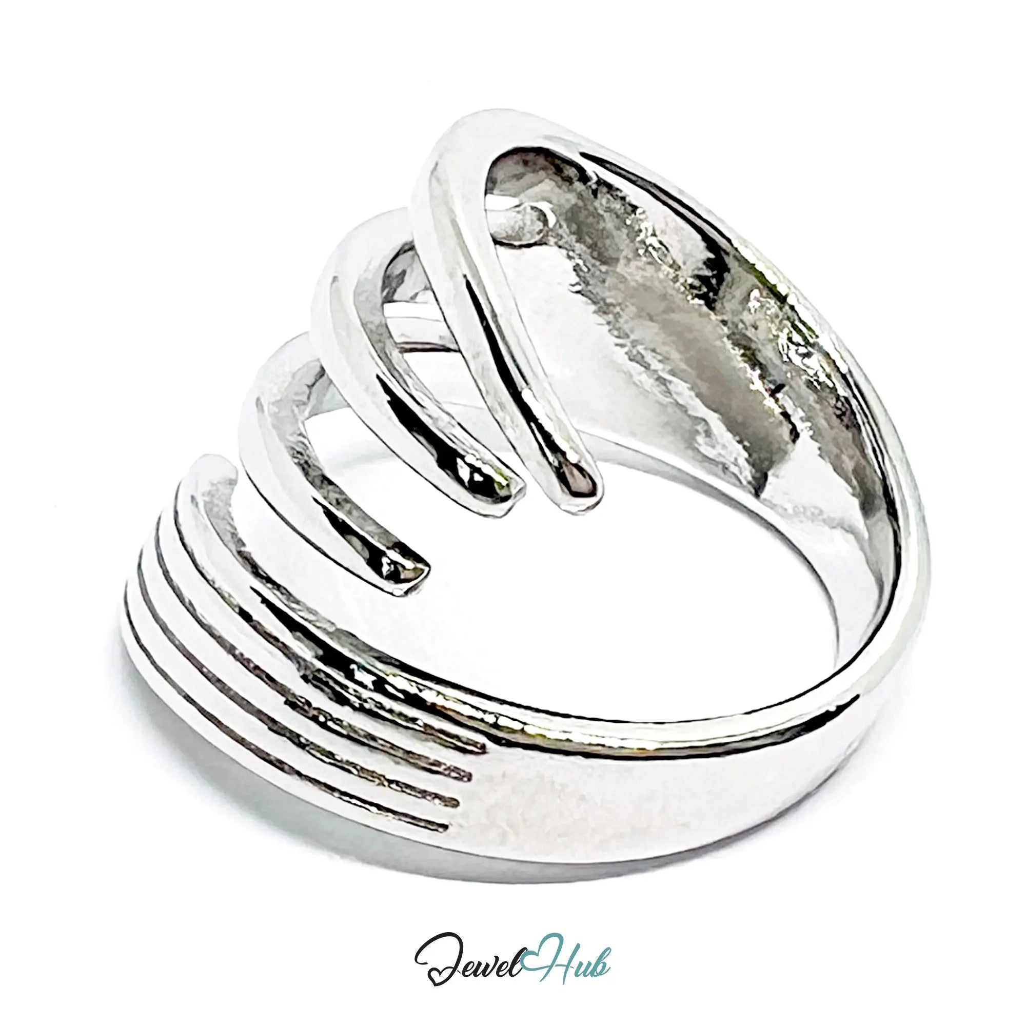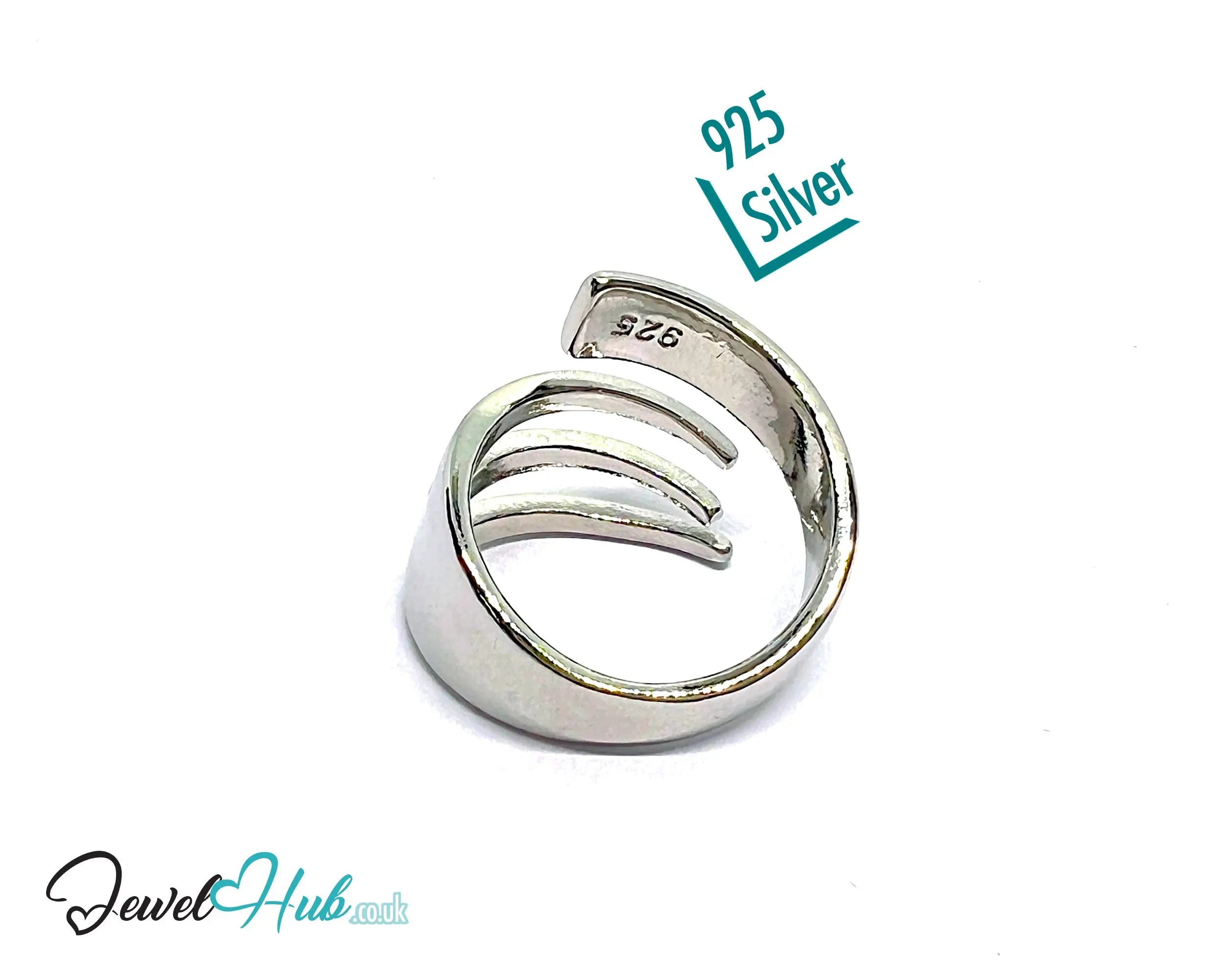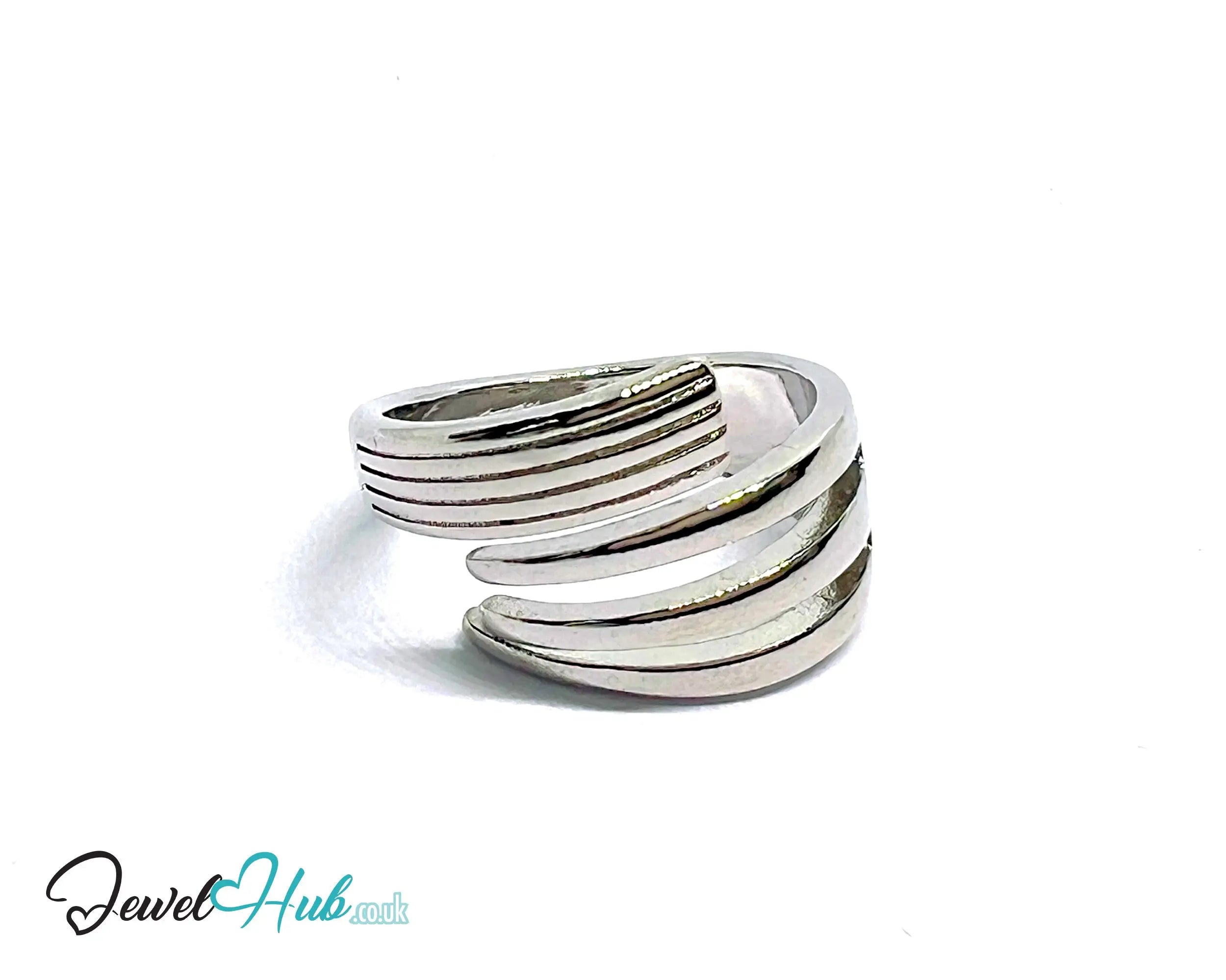 This hallmarked 925 layered silver ring features a dynamic multi-band silhouette with curved, overlapping lines that wrap the finger in polished texture. Weighing 5.22 grams, its asymmetrical form and reflective surface create a bold yet wearable statement—perfect for those drawn to abstract design and minimalist edge.