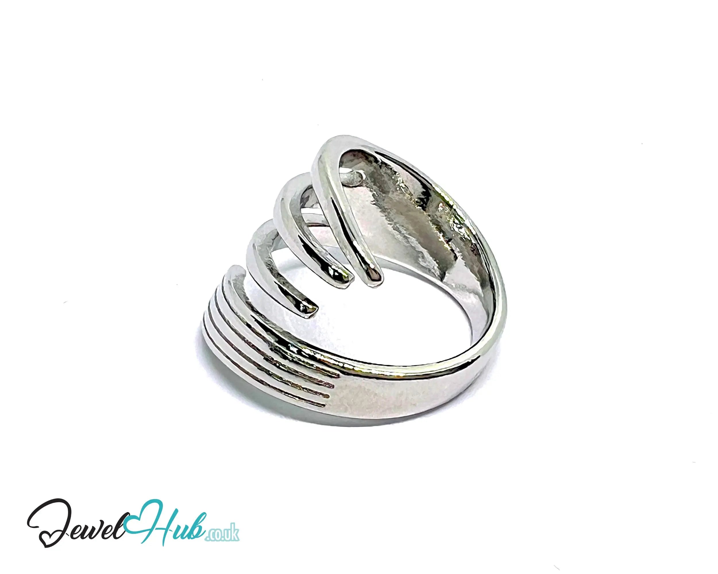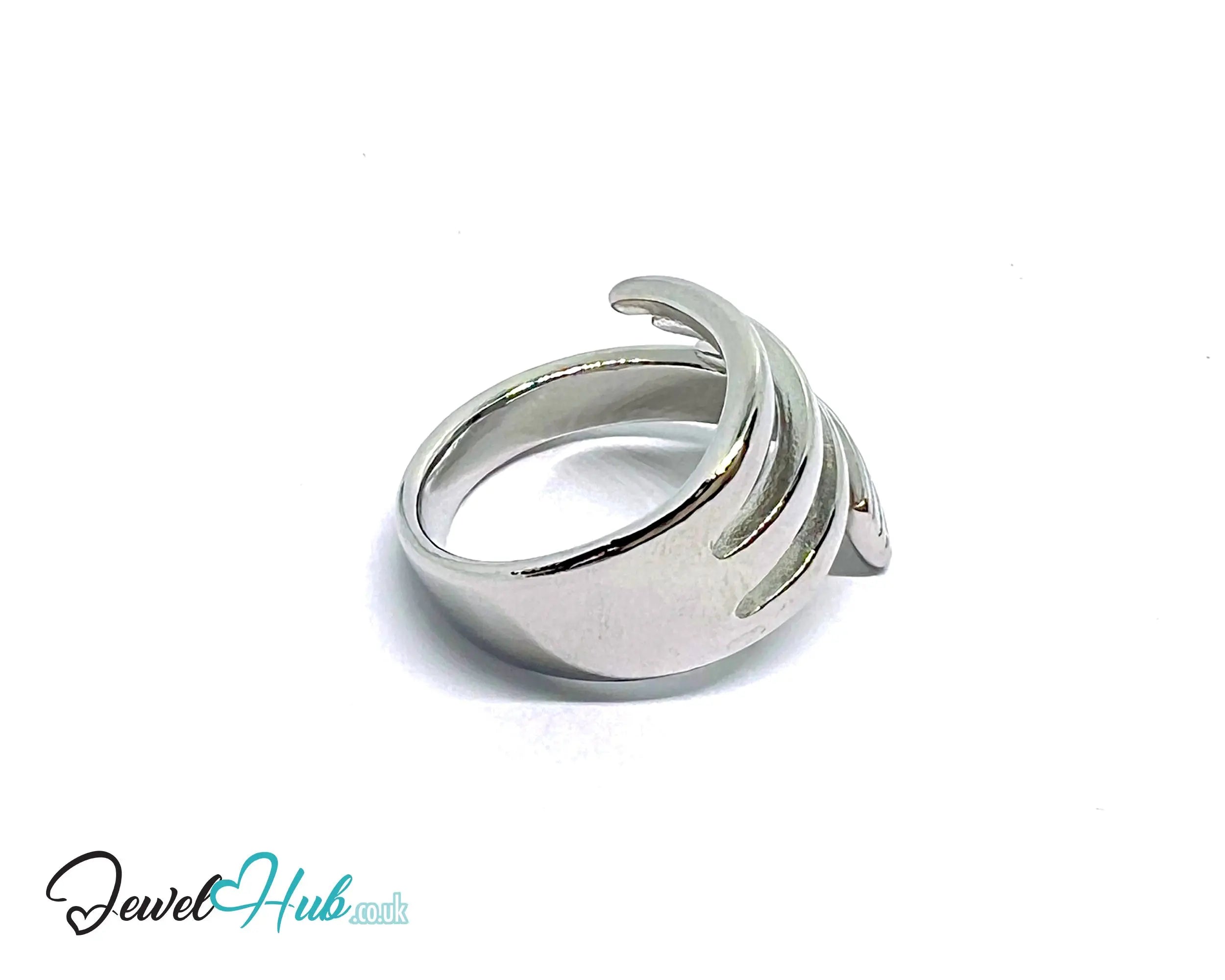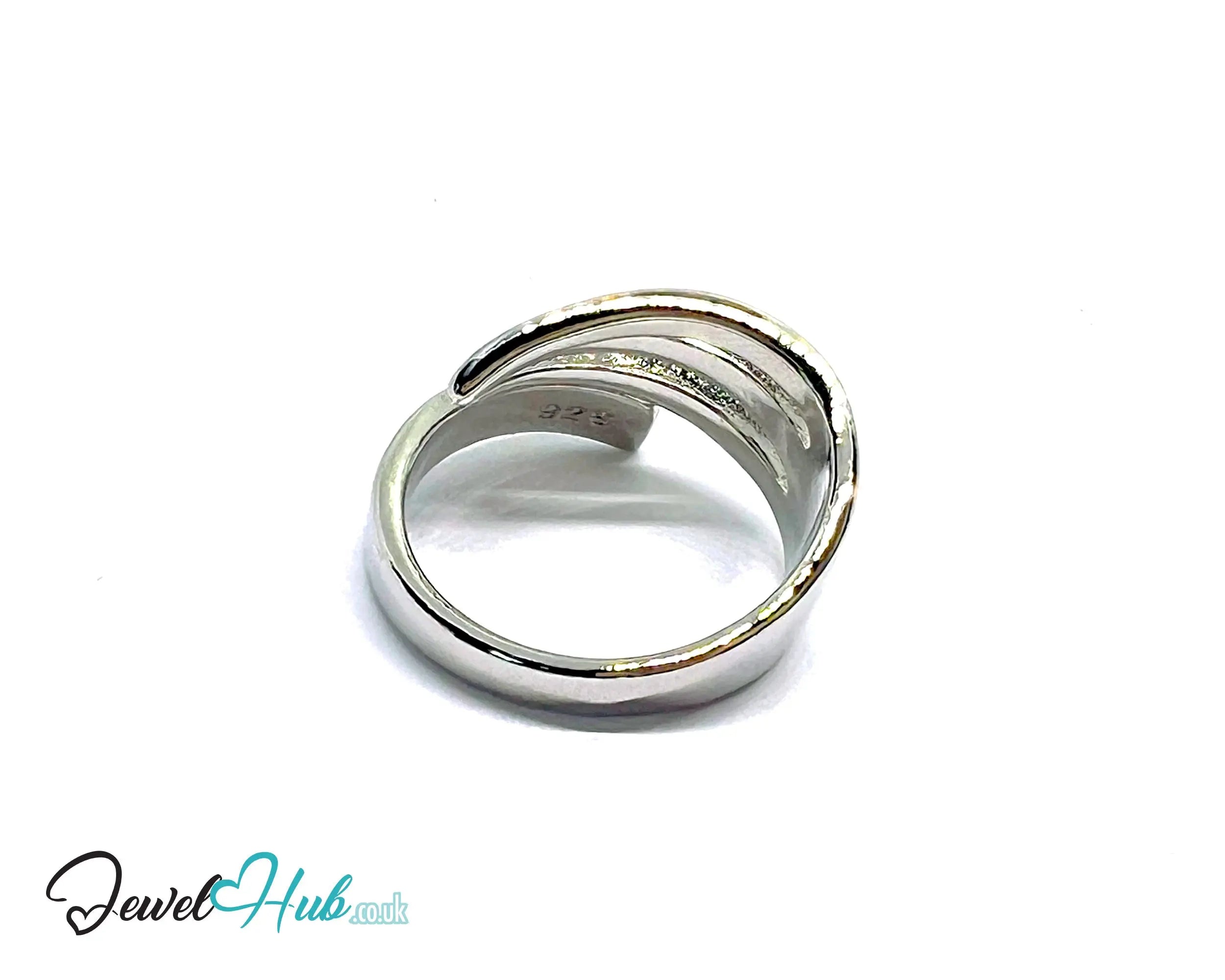 This hallmarked 925 layered silver ring features a dynamic multi-band silhouette with curved, overlapping lines that wrap the finger in polished texture. Weighing 5.22 grams, its asymmetrical form and reflective surface create a bold yet wearable statement—perfect for those drawn to abstract design and minimalist edge.