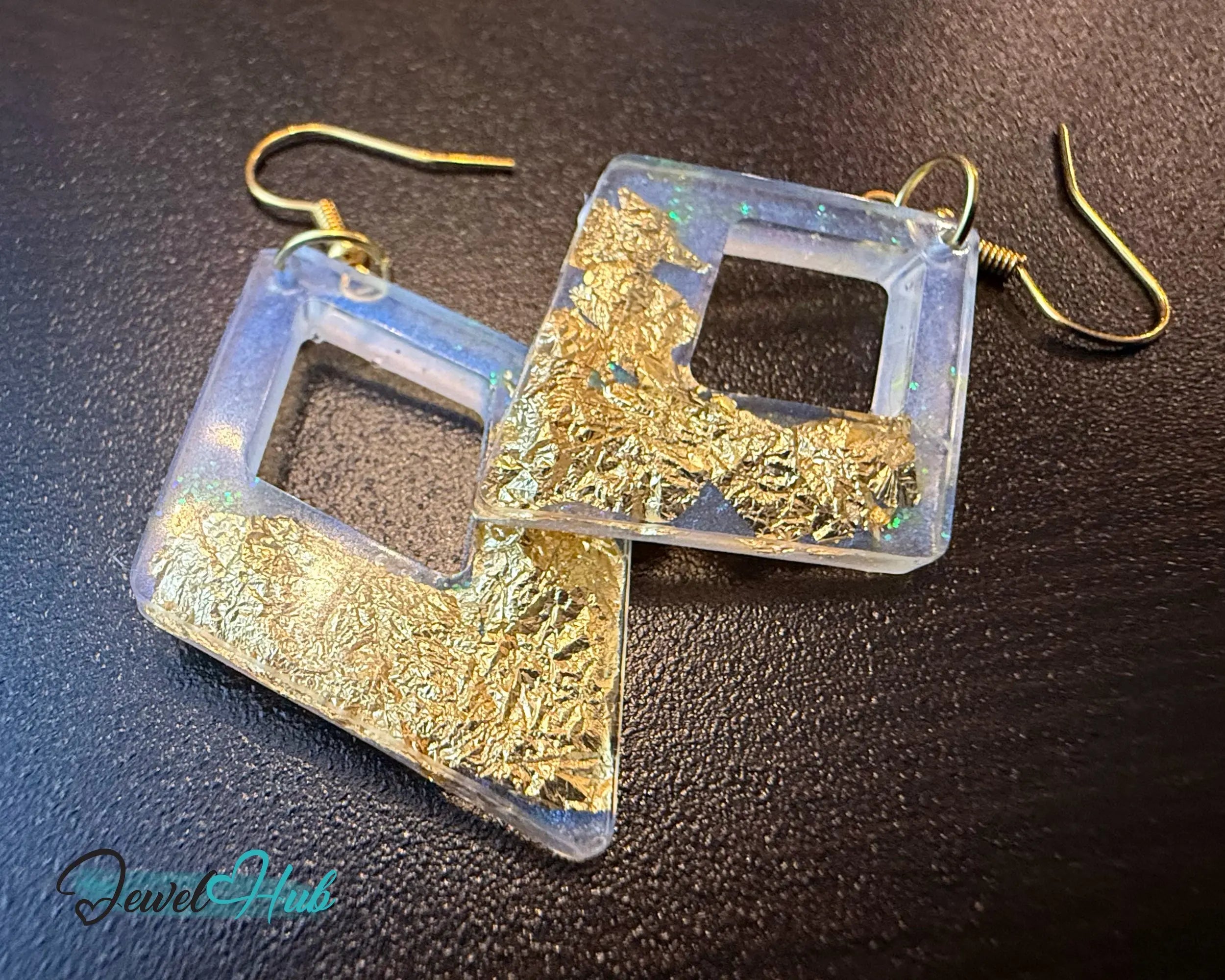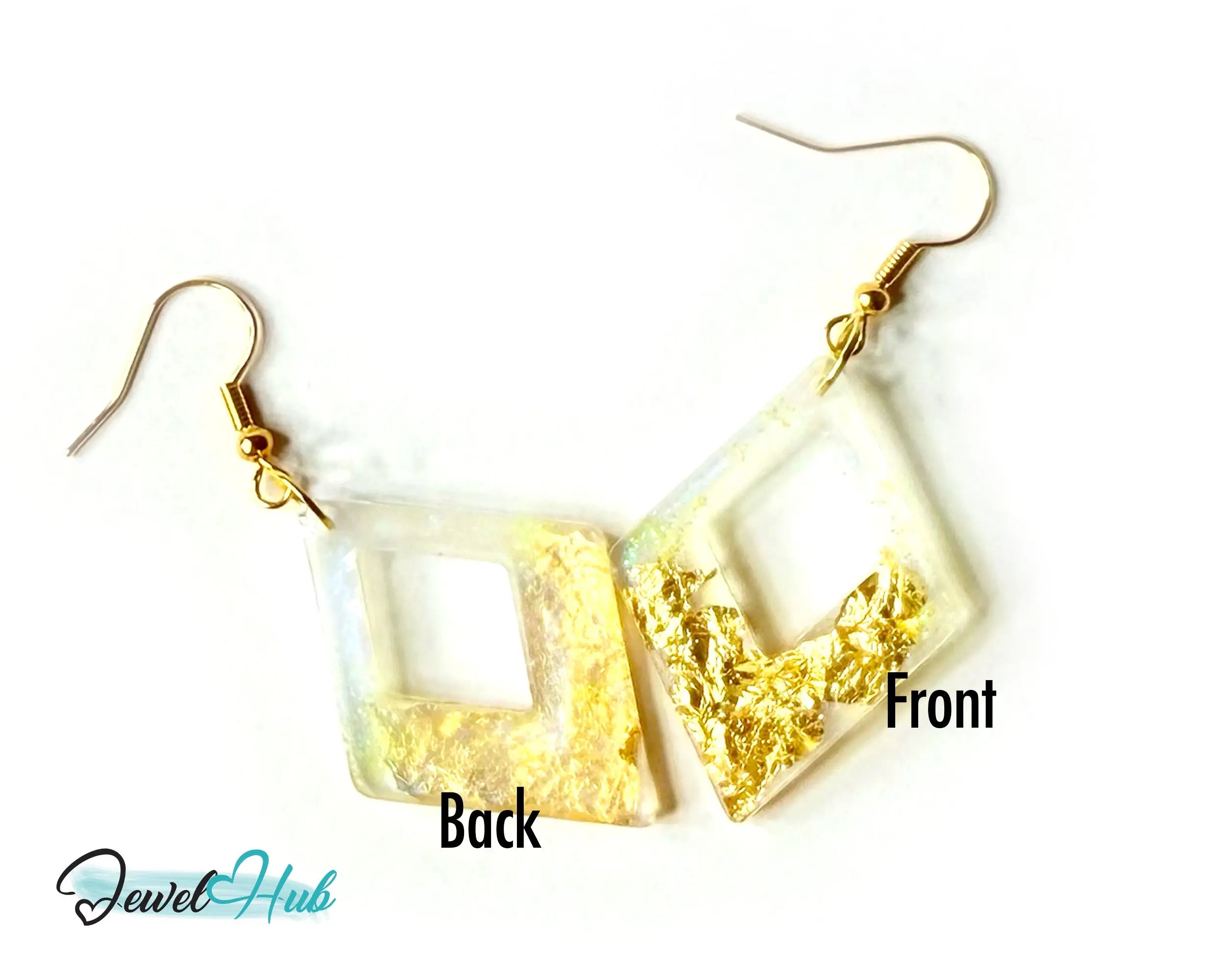 Crafted using UV resin, these earrings feature a mesmerizing combination of yellowish glitter, gold flakes, and a milky color dye. The kite-shaped design adds a modern and geometric flair, while the transparent resin material allows the sparkling elements to shine through.