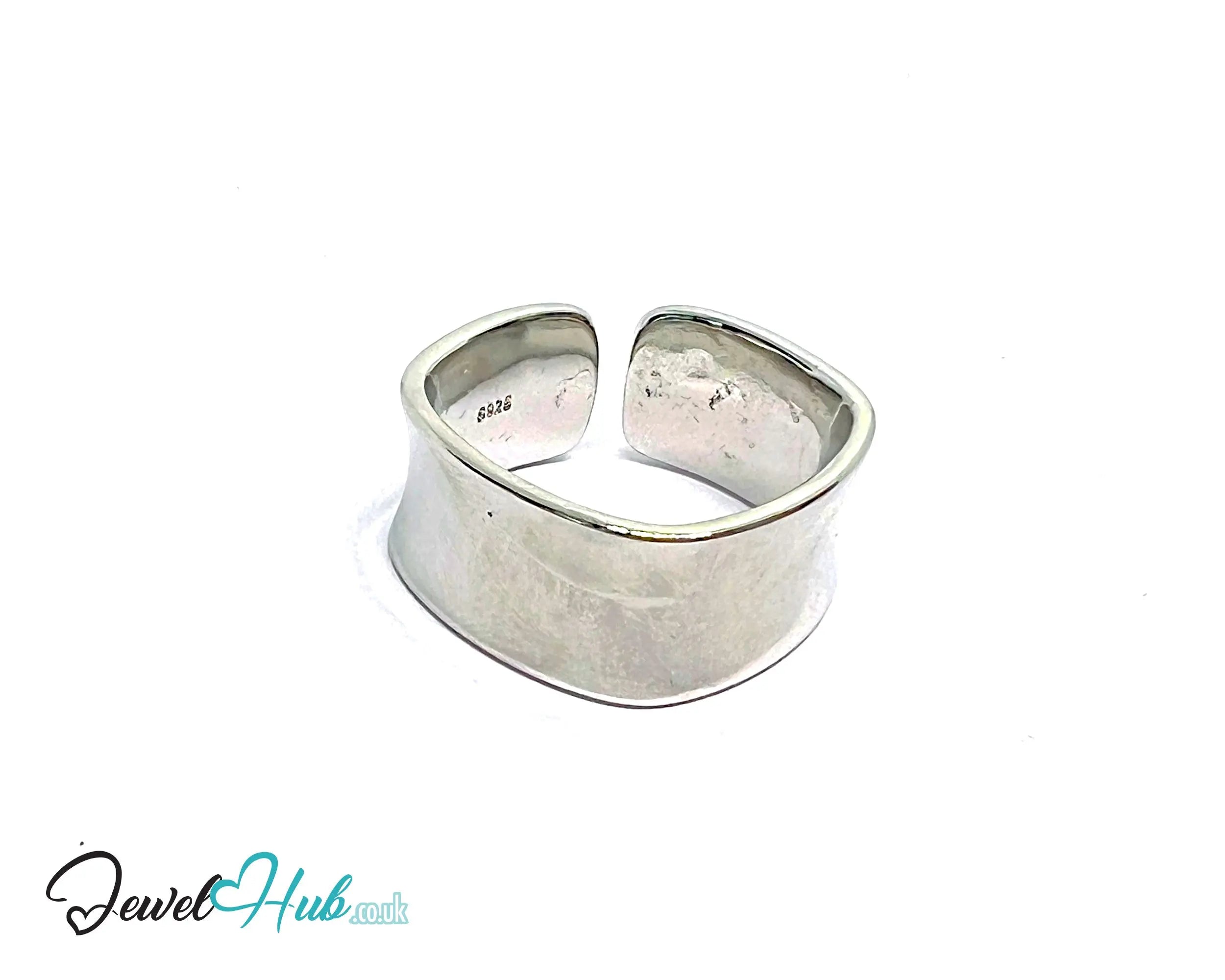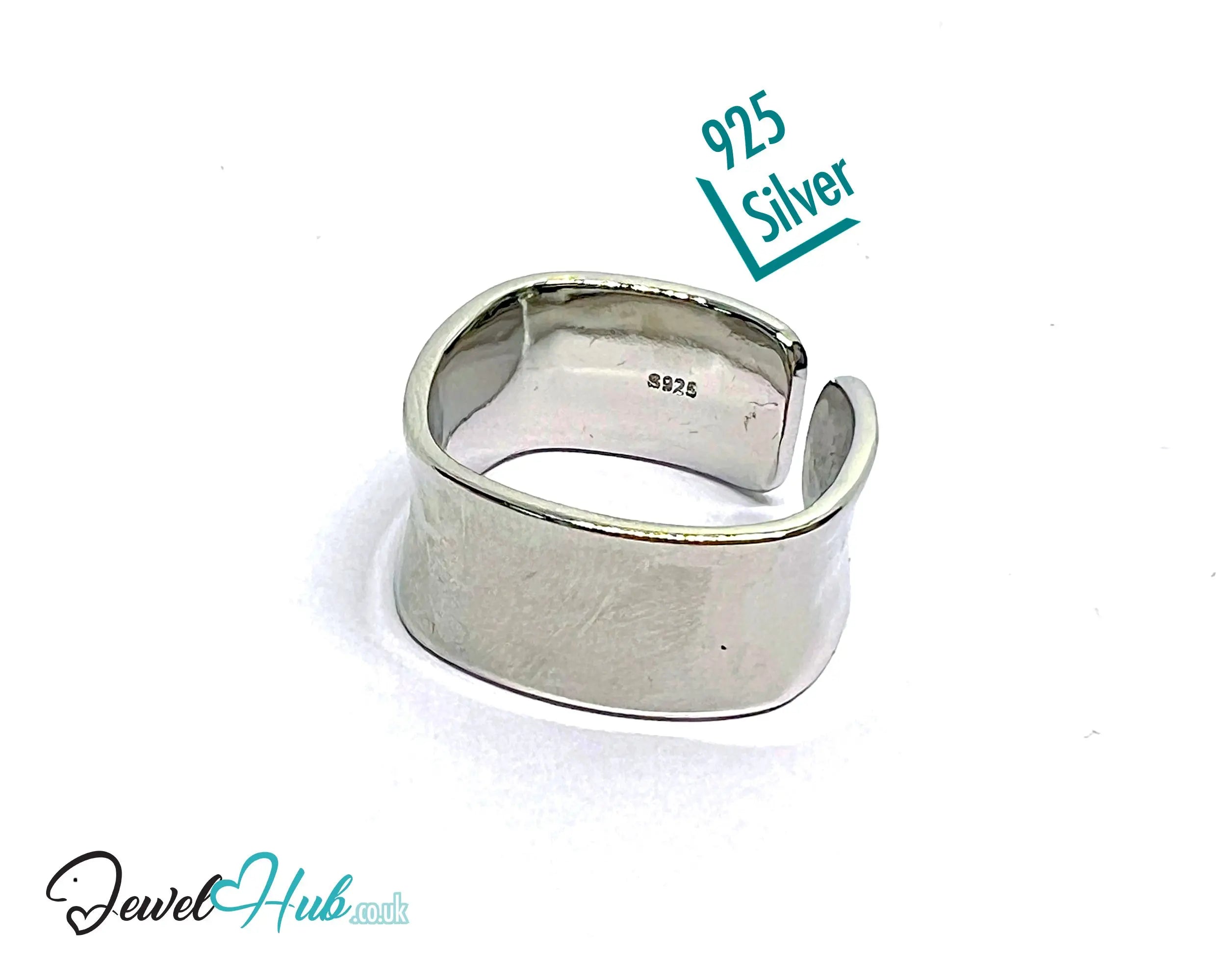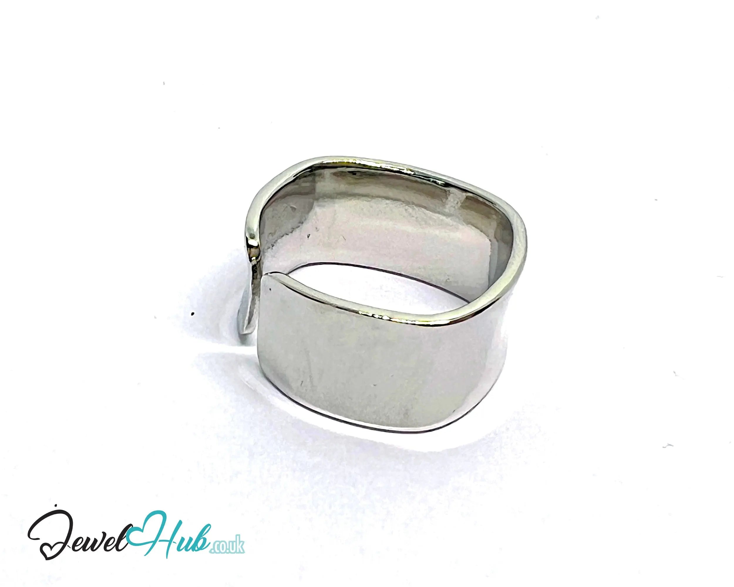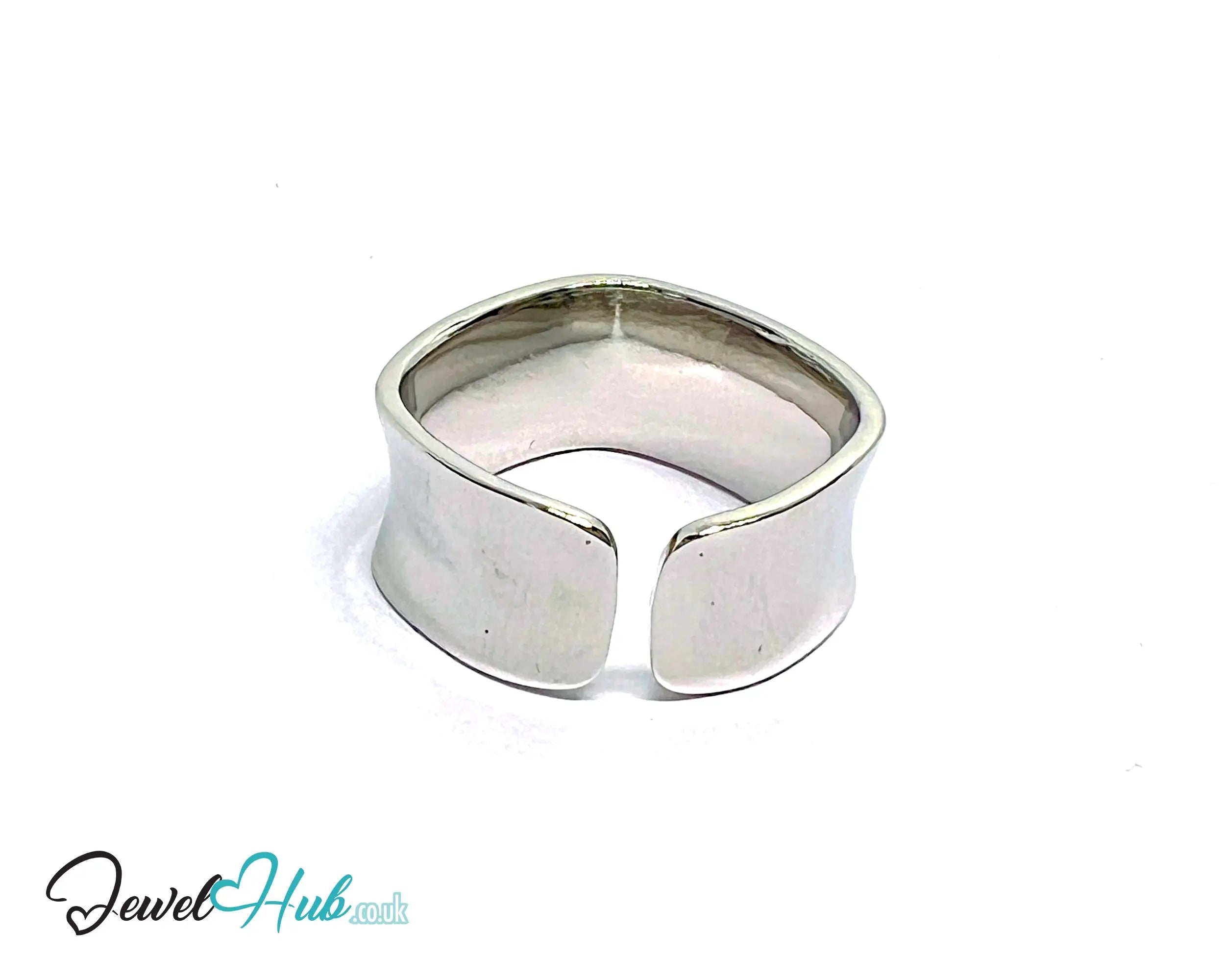 A sleek silver ring Adjustable Wide Band with sculptural curves and minimalist edge.