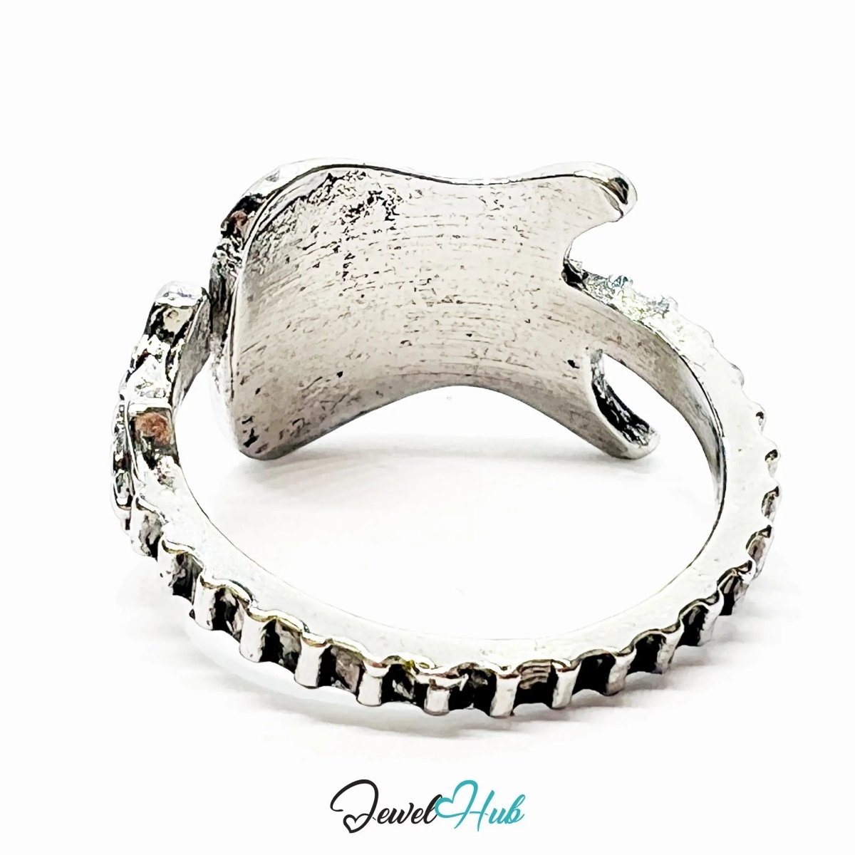 This Zinc Alloy Ring is a sculptural riff — bold, rhythmic, and unapologetically punk. Weighing 2.80 grams and cast in fixed UK size Q, it features a stylised electric guitar form with gold-accented pickups and bridge. The band mimics fretwork and string tension, creating a tactile rhythm that wraps around the finger like a chord in motion. The silver plating adds cool gleam, while the gold details amplify contrast and clarity. This ring is perfect for wearers who favour music as identity and form as rebellion. Whether worn solo or stacked with chain-inspired or anatomical bands, it offers sculptural grit and emotional resonance. A ring of rhythm and stance — for those who wear sound as symbol.