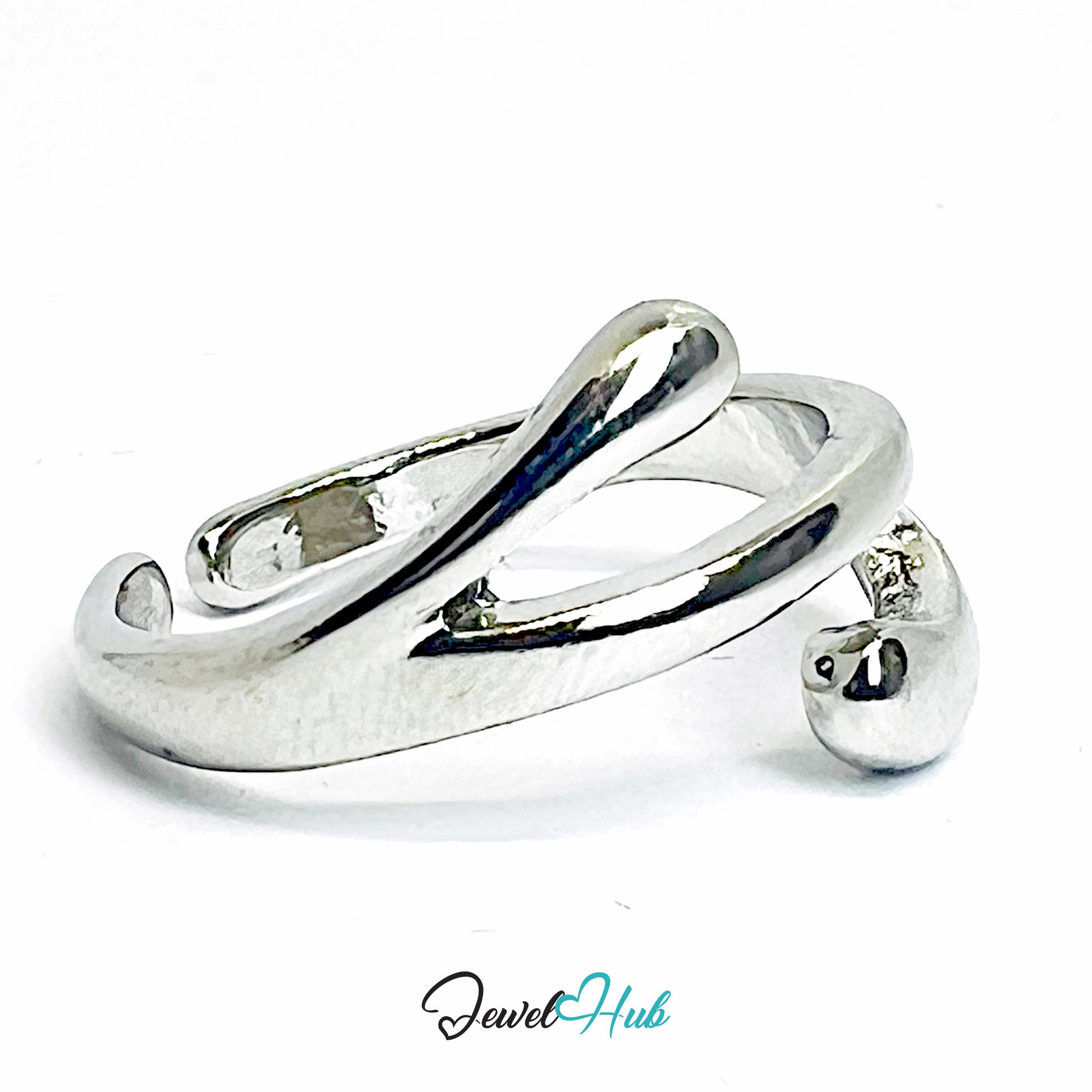 This Silver-Plated Zinc Alloy Ring features a flowing, sculptural design built from interlinked, fluid segments that wrap around the finger with organic movement. Weighing approximately 2.35 grams, the form feels light yet visually striking, with smooth contours that create shifting highlights and soft shadow lines. The layered structure gives the ring a sense of motion, as if the metal is gently folding and flowing in place.