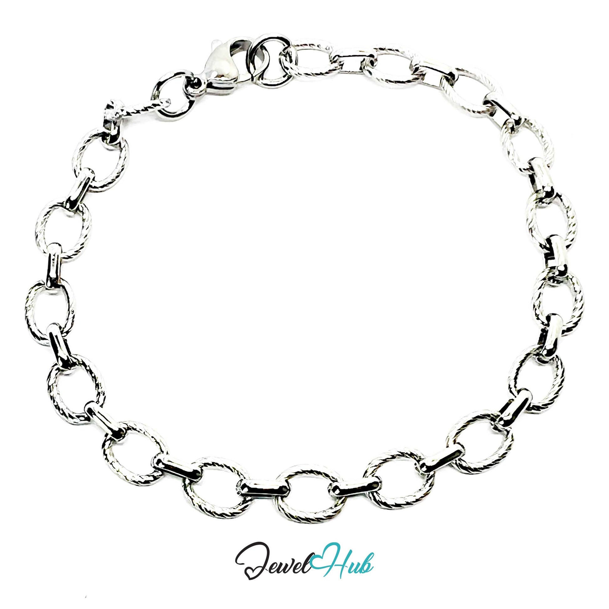 This Rope and Circle Link Silver Bracelet is a cool‑tone twist on a textured chain classic. Rope‑effect oval links and smooth circle connectors create a fluid, dimensional pattern that sits neatly around the wrist. With an approximate weight of 6.9 g at a 21 cm length, it feels light yet refined, making it an easy choice for everyday wear and layered looks.