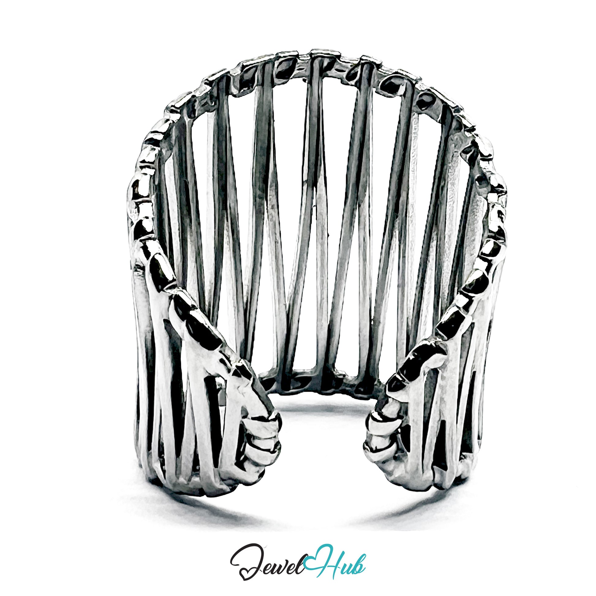 This stainless steel silver ring features a dramatic vertical cage design formed from multiple elongated metal bars that rise upward to create a bold architectural structure. The open framework surrounds the finger with tall parallel lines, producing a striking sculptural silhouette that immediately draws attention. Each bar varies slightly in angle and contour, giving the ring an organic handcrafted appearance while maintaining a modern geometric rhythm.