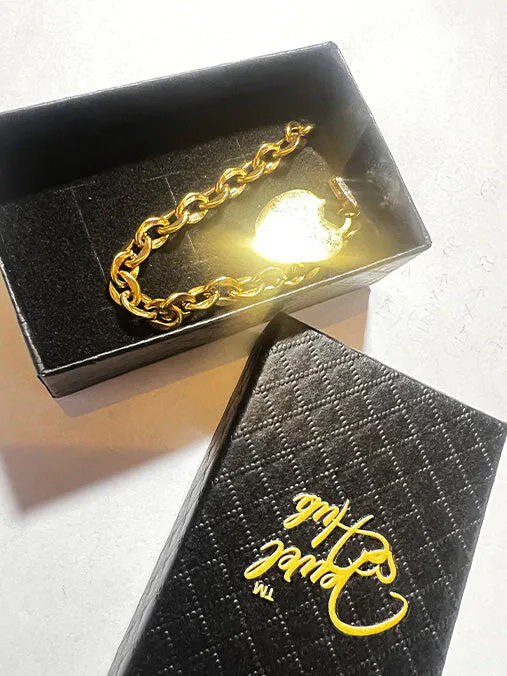 This gold-finished titanium steel bracelet pairs a sculptural chain with two heart charms — one smooth and reflective, the other pavé‑set with 30 sparkling zirconia stones. With its warm tone and bold proportions, it’s a romantic statement piece designed for everyday wear.