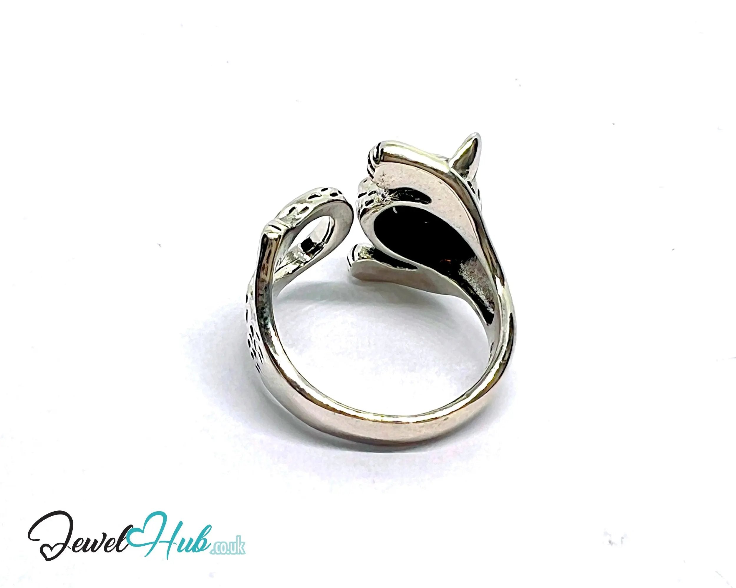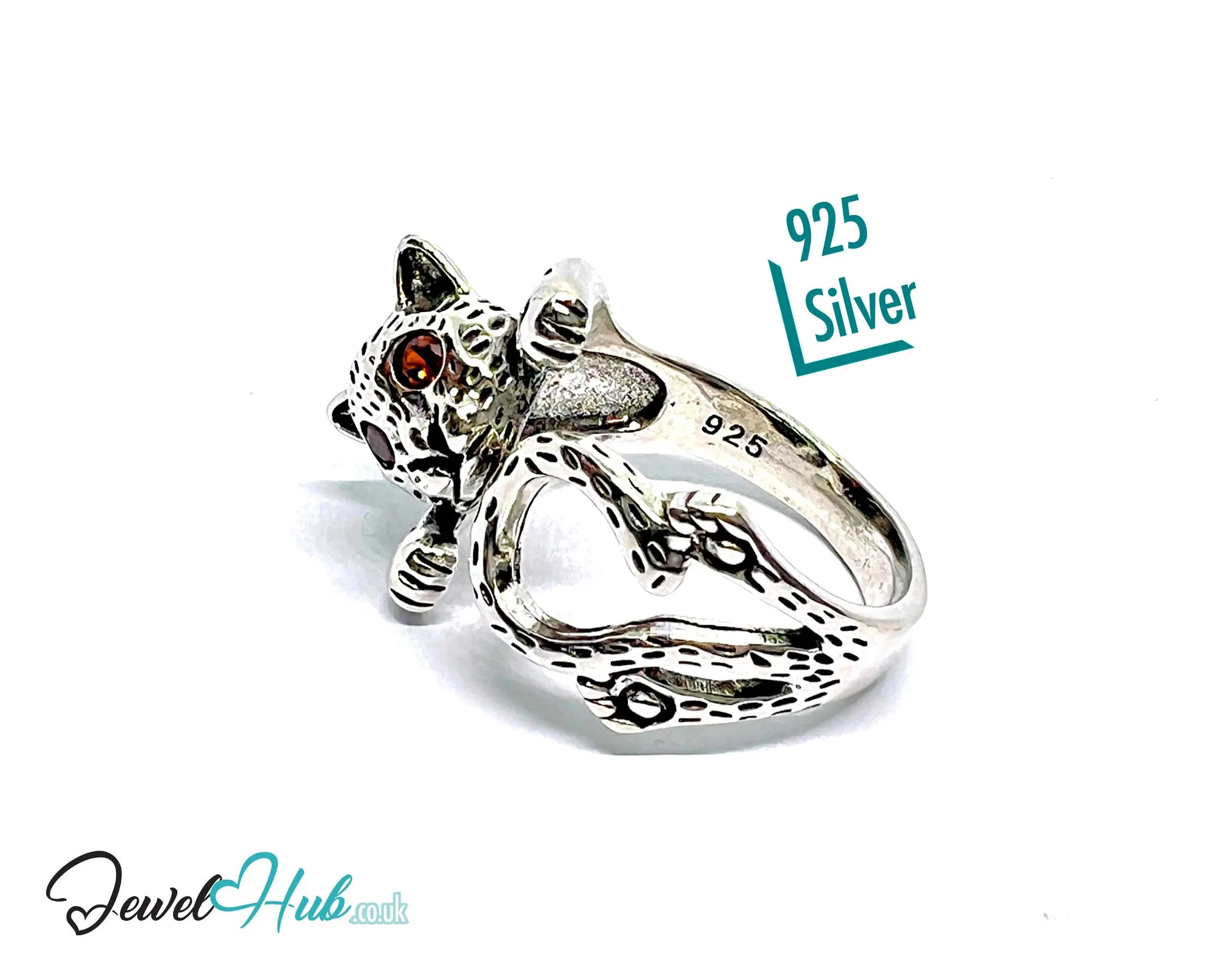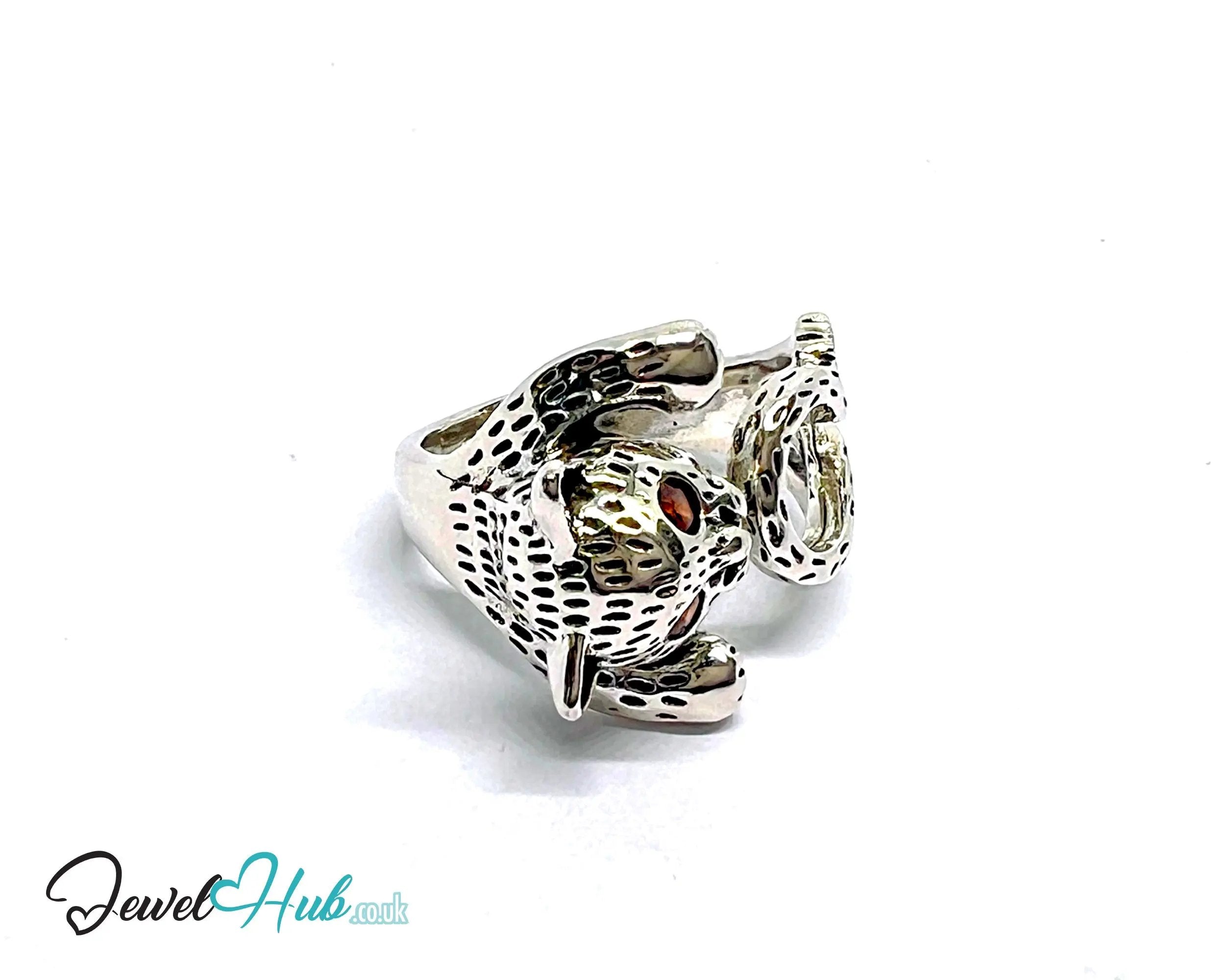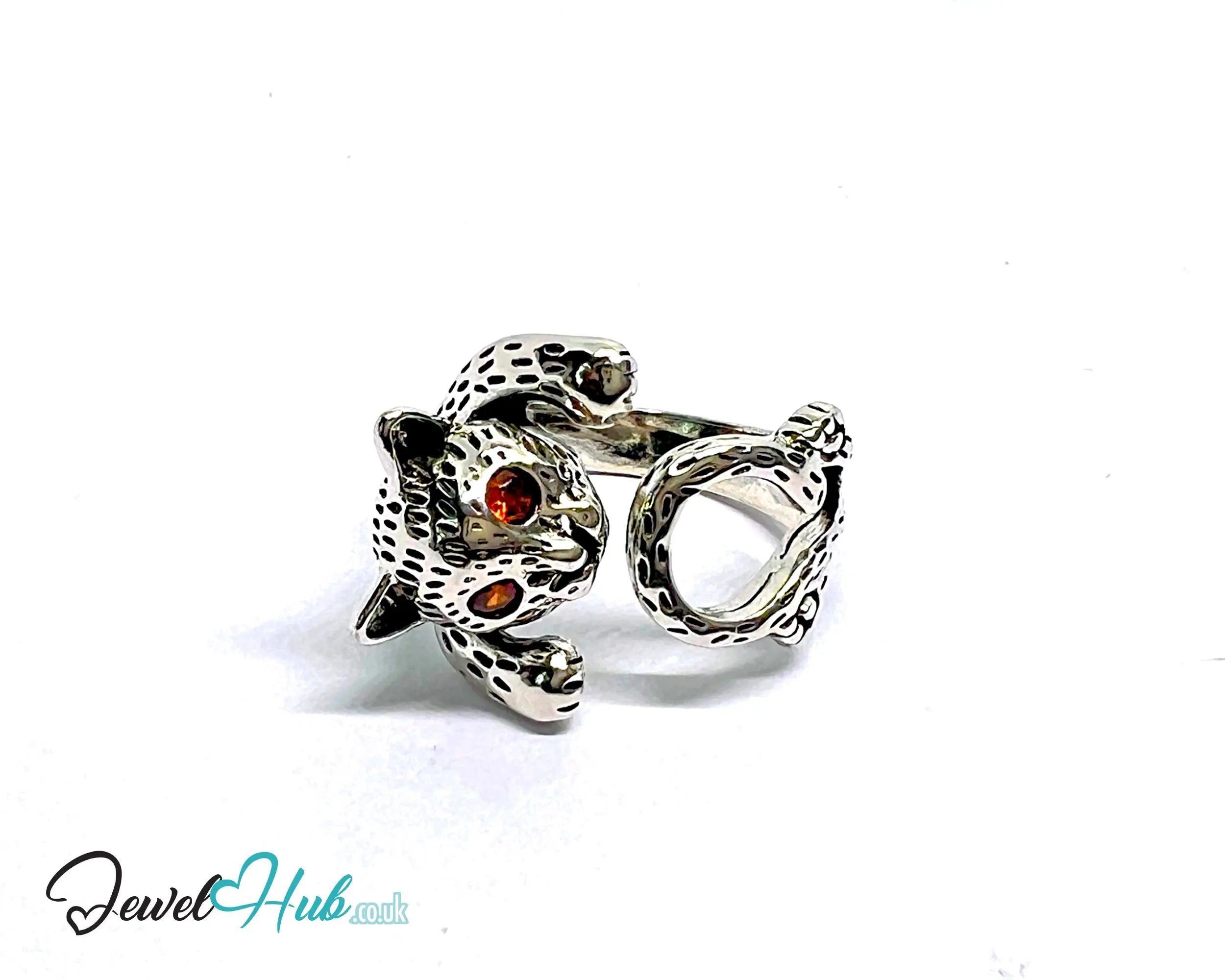 This Wild Cat Silver Ring is made from fully hallmarked 925 sterling silver and weighs 5.65 grams. Its open-ended band adjusts across UK sizes O, P, and Q, wrapping the finger with a lifelike feline form. Red gemstone eyes and textured paws add depth and drama, making this silver ring a standout piece for collectors and bold stylists.