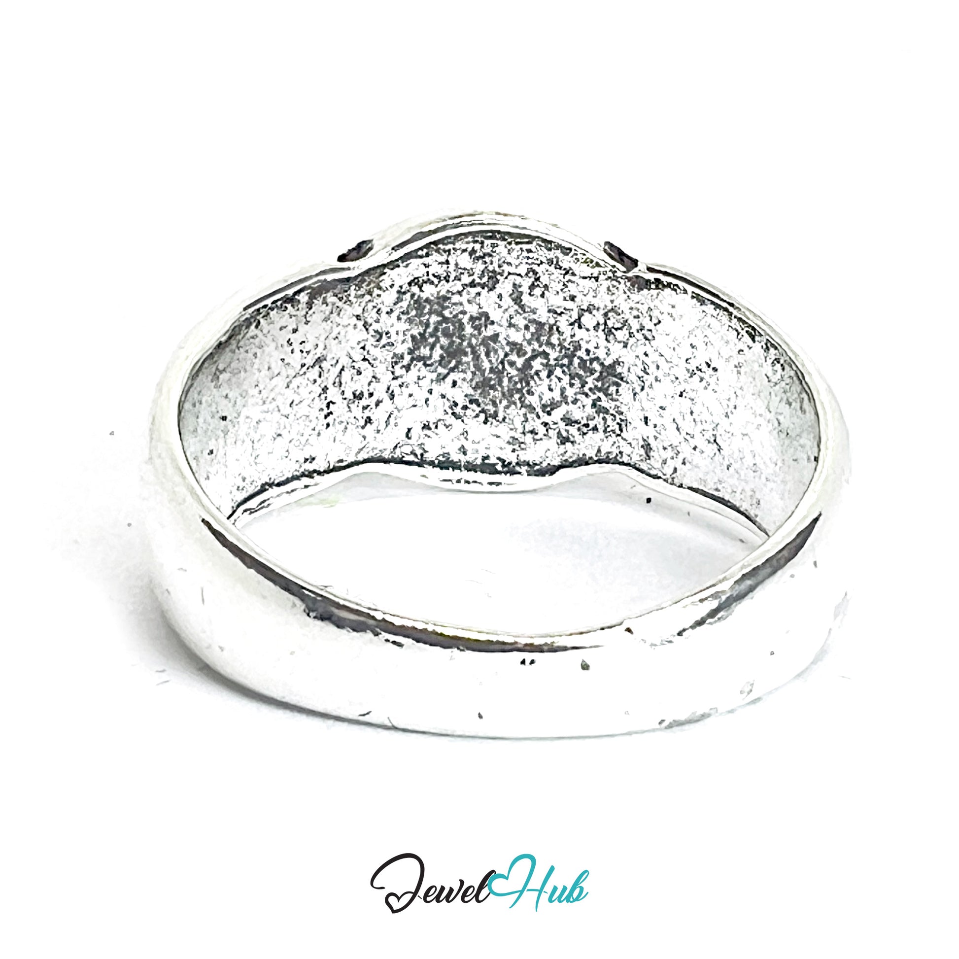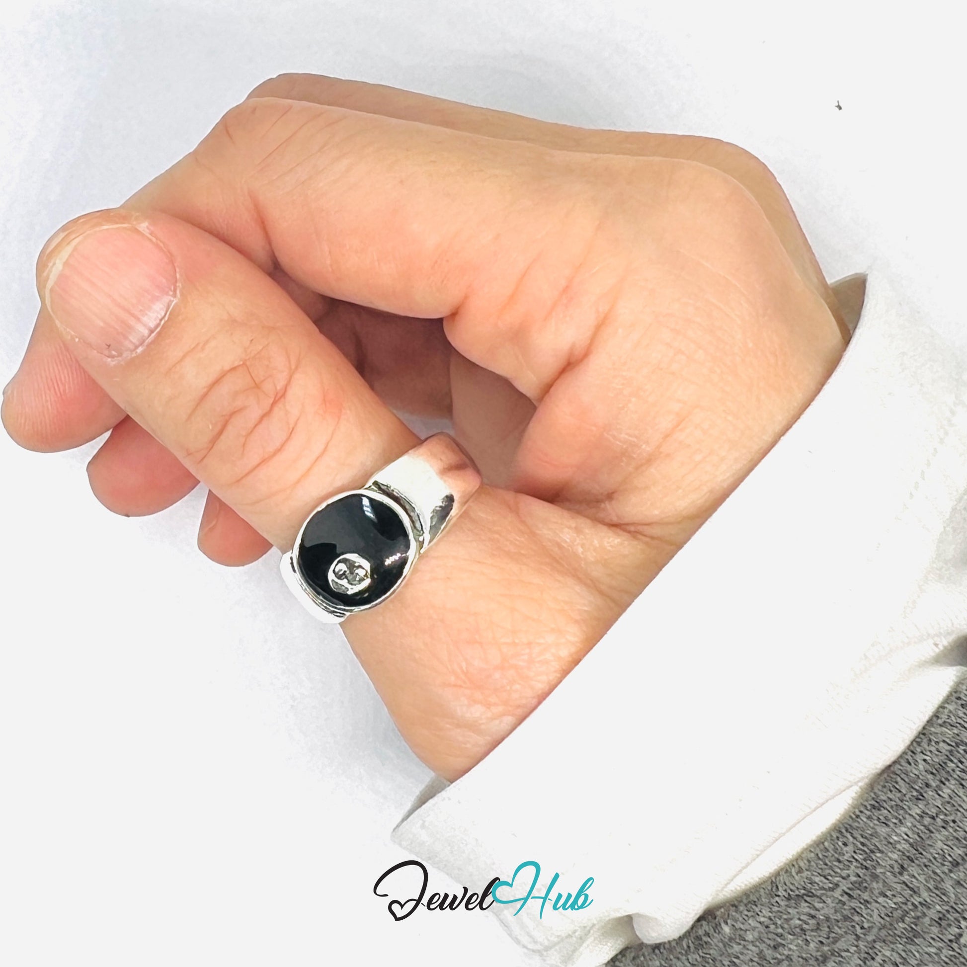This zinc alloy silver‑plated punk ring is a bold signet design featuring a large, glossy black 8-ball set in polished silver-tone frame, with a silver octagon window revealing the iconic number 8 or fortune-telling symbol at its centre. The band is textured and distressed with oxidised detailing along the sides, creating raw, lived-in aesthetic. The 8-ball's hypnotic dark sphere creates intense visual presence. At approximately 6.66 g total weight, it's weighty and commanding—a collector's piece celebrating risk, chance and the punk embrace of fate.