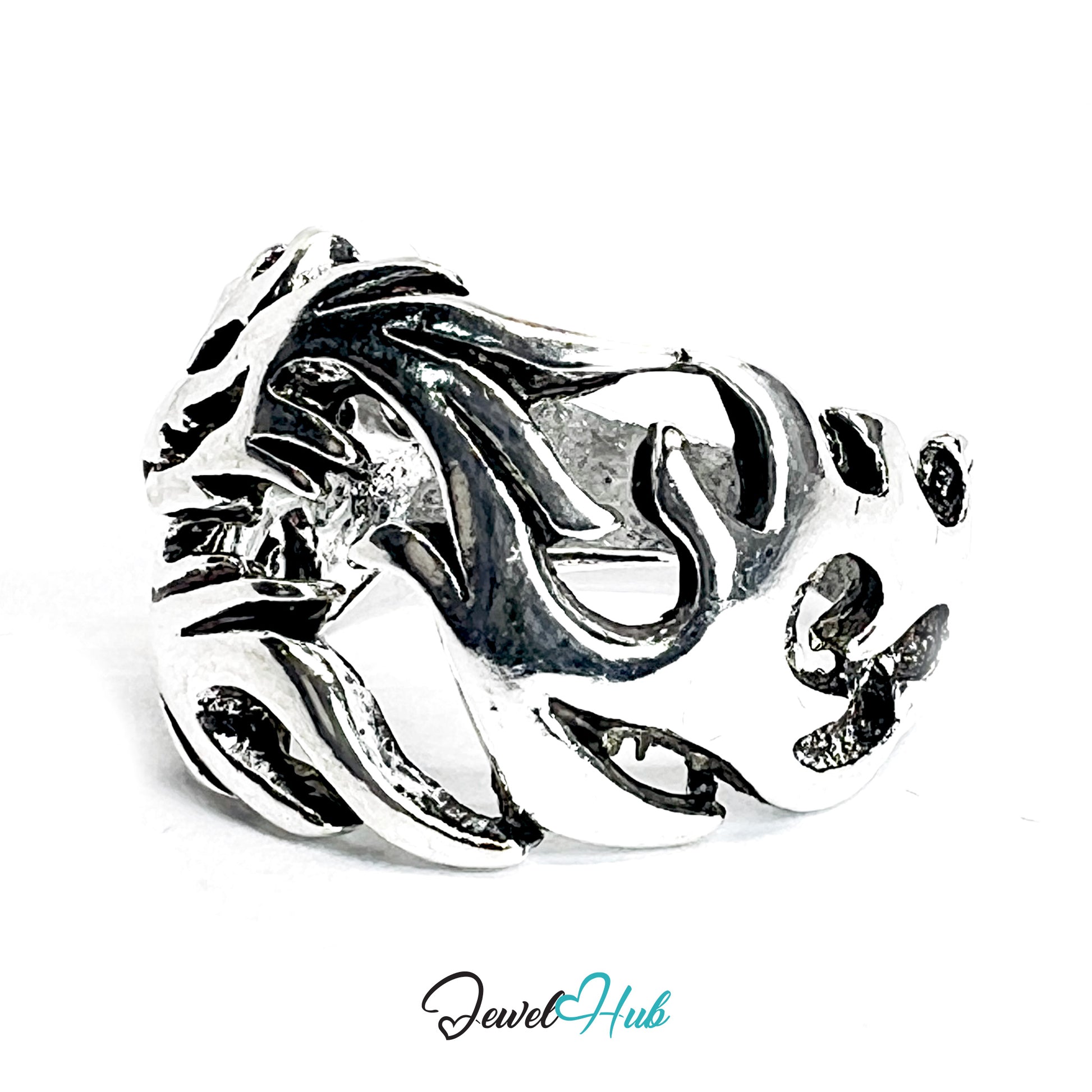Fixed at UK R / US 8.5 / EU 58 / ⌀ 19.0 mm / Cir. 59 mm, this ring dominates the ring or middle finger as a gallery-quality statement. Dragons symbolise power, ancient wisdom, transformation and rebellion—core punk values rendered through flowing, architectural design. Wear as wearable mythology that challenges conventional ring aesthetics.