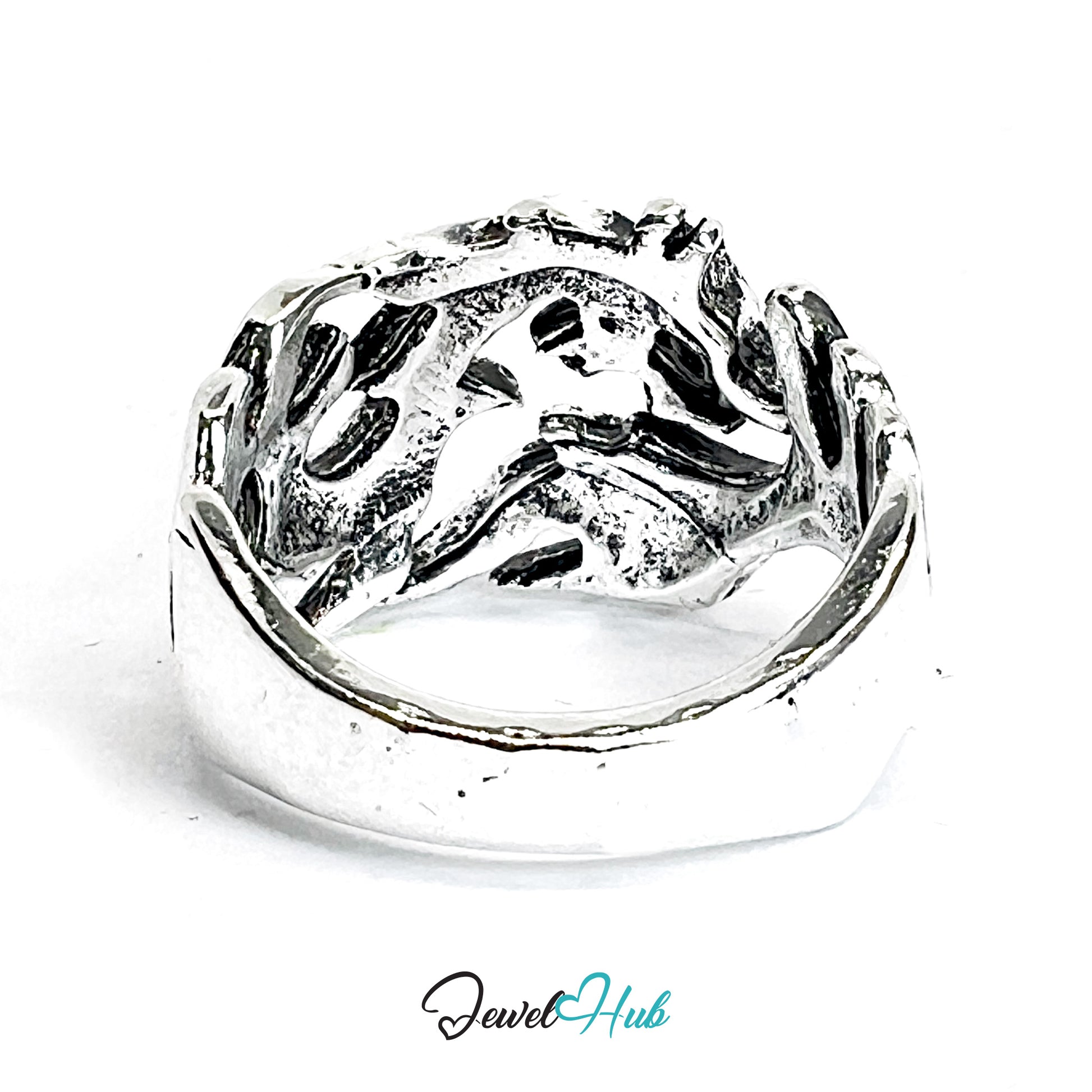 This zinc alloy silver‑plated punk ring is a sweeping, dramatic sculptural design inspired by layered dragon wings rendered in sharp, dynamic geometry. Multiple angular wing-like structures cascade and fold across the band with organic fluidity, creating a three‑dimensional architectural silhouette that shifts appearance with every movement. The surface alternates between polished bright silver and deeply oxidised recesses, emphasising shadow, texture and mythic presence. At approximately 6.55 g total weight, it's weighty and commanding—a true collector's art piece that feels like wearable dragon-inspired sculpture.