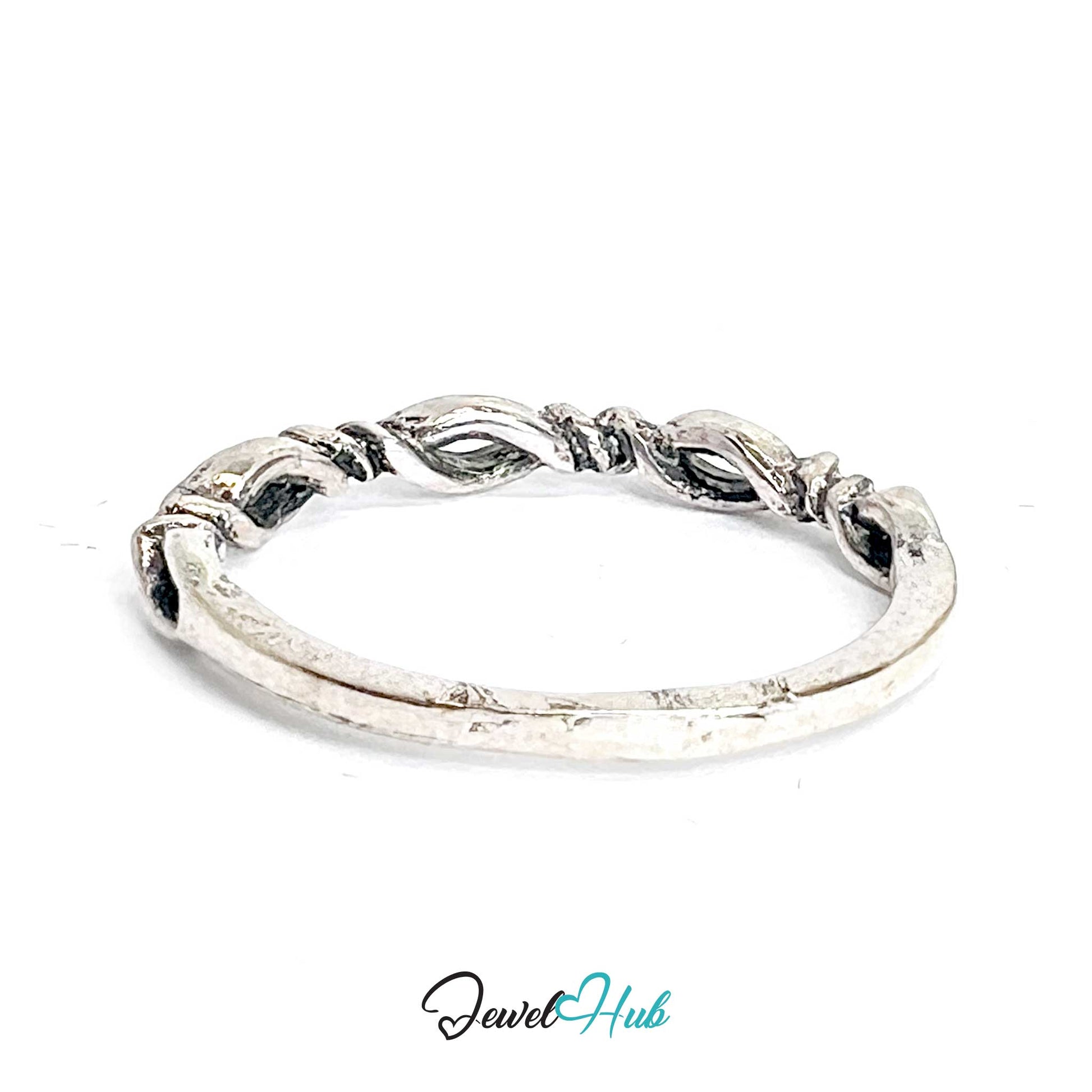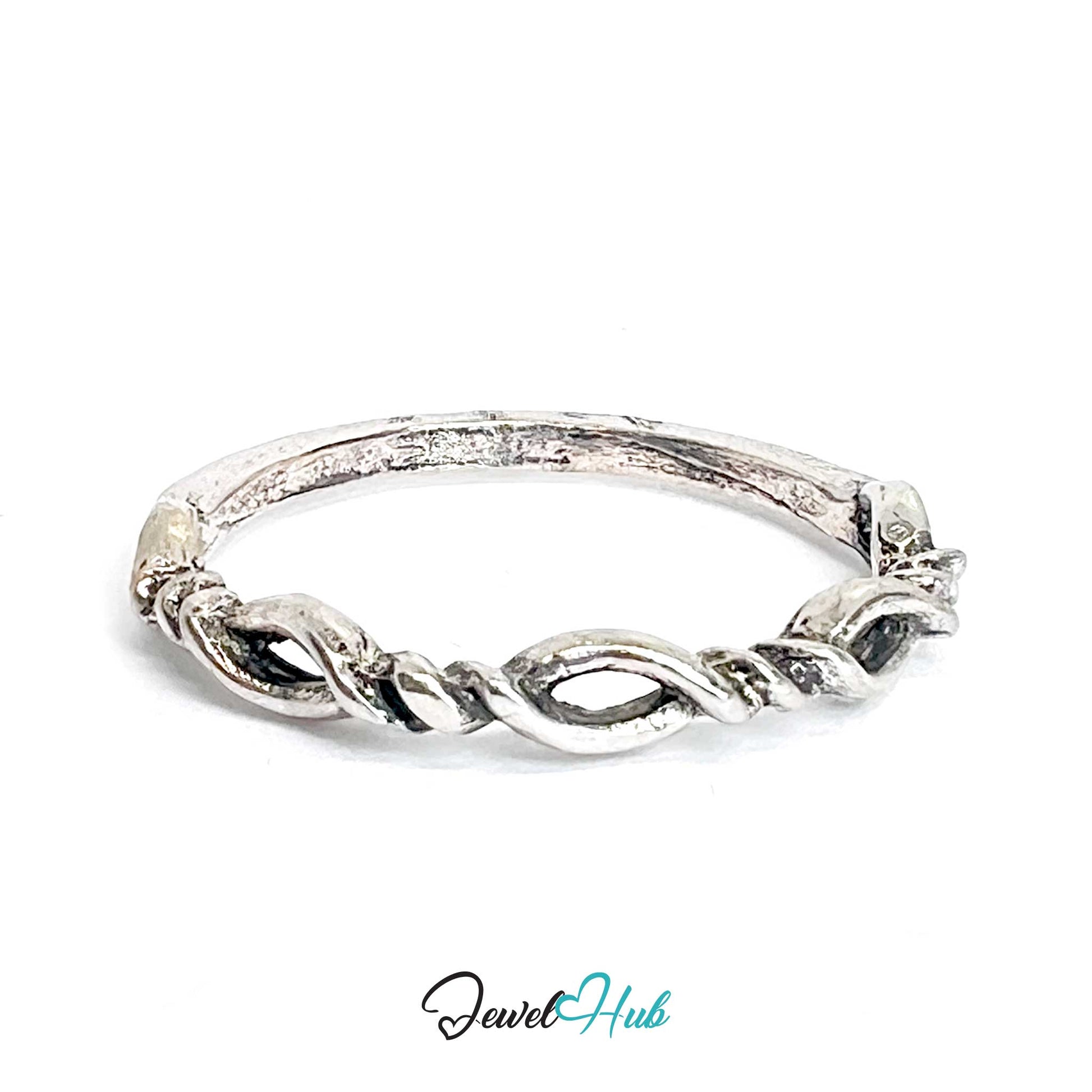 | Design | Slim twisted band with open loop detailing on the front |