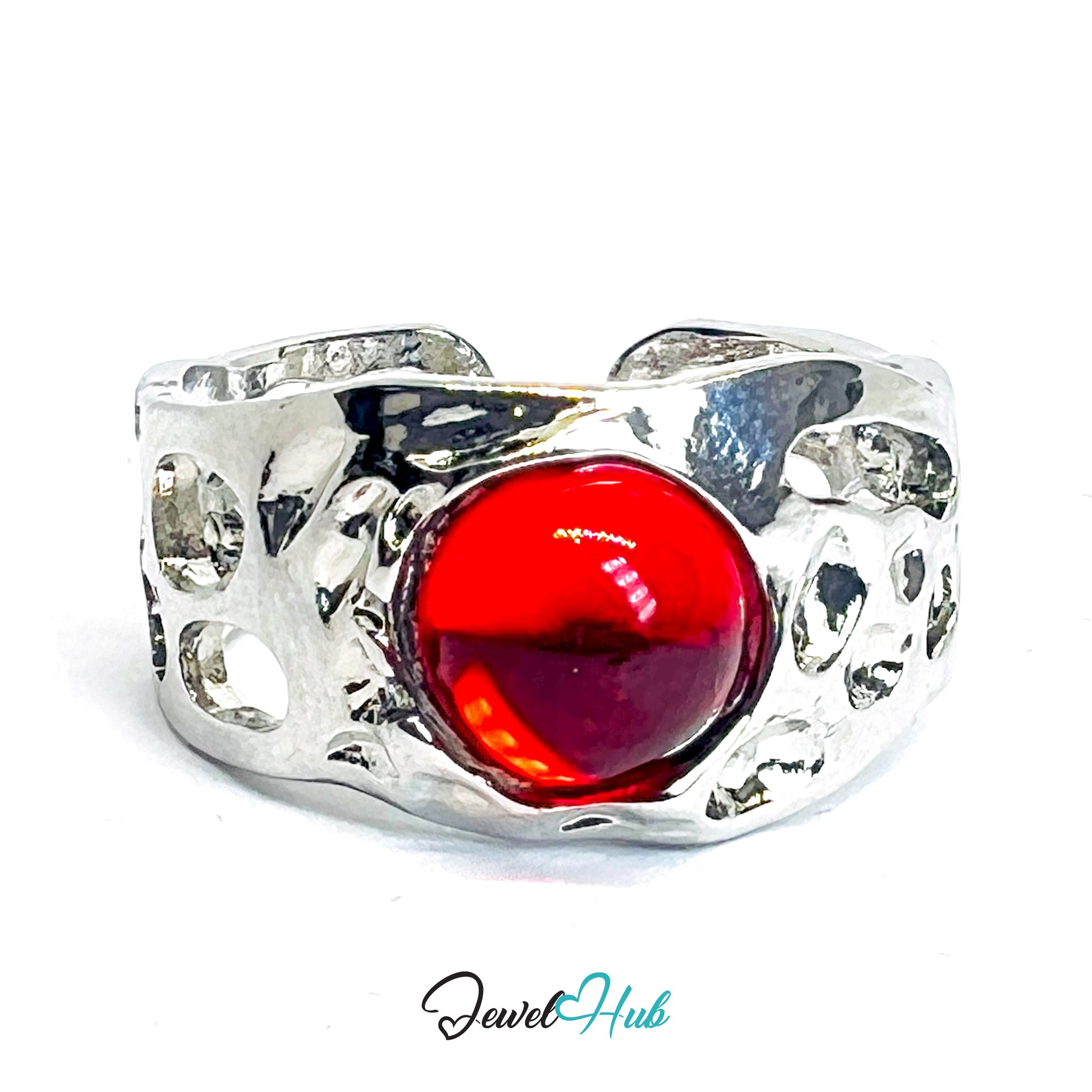 This Zinc Alloy Silver‑Plated Ring pairs a wide geometric cutout band with a smooth translucent red resin stone at the centre, creating a bold, sculptural silhouette. The irregular openwork and polished metal surface catch the light from every angle, while the vivid red cabochon brings a rich, glowing contrast to the cool silver‑tone setting.